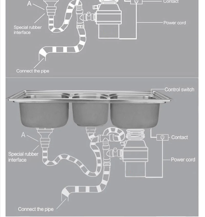 Воздушный выключатель и защита от перегрузки: одно дно решает кухонный мусор. Воздушный переключатель использует пневматический принцип, делает его более легким и безопасным для запуска машины. Защита от перегрузки в нижней части защищает двигатель, когда он перегружен, перегревается и так далее, продлевая срок службы двигателя, поэтому, пожалуйста, держите его touchable при установке.