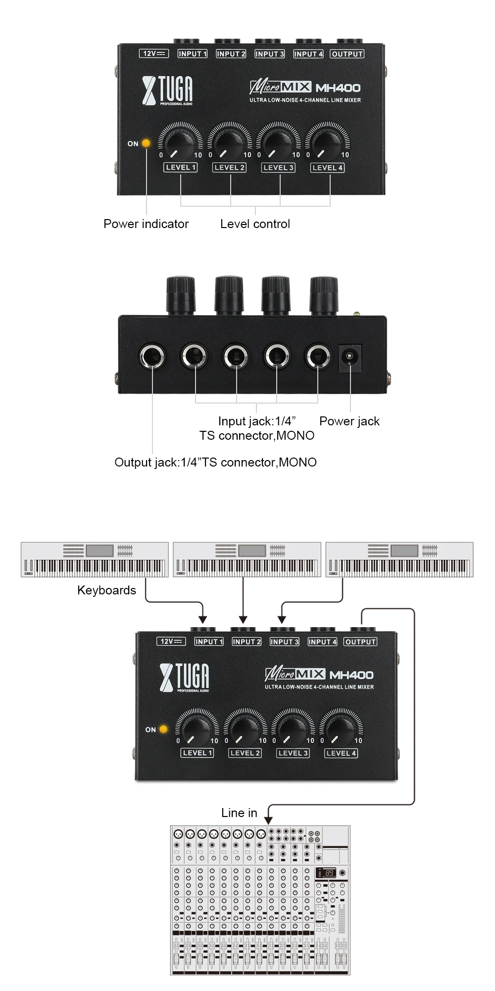 Расширение возможностей миксеров стандартного размера-это место, где MH400 работает своей магией, например, когда он используется в качестве промежуточного миксера. Если вы работаете на доступных каналах на миксере «большой» и вам нужно добавить еще 3 клавиатуры в ваш микс, просто подключите их к MH400, dial-in mix-и Подключите выход mh400 к одному входу на главном миксере. Это всего лишь один пример того, как MH400 может добавить универсальность к вашей текущей настройке-просто вообразите возможности!
