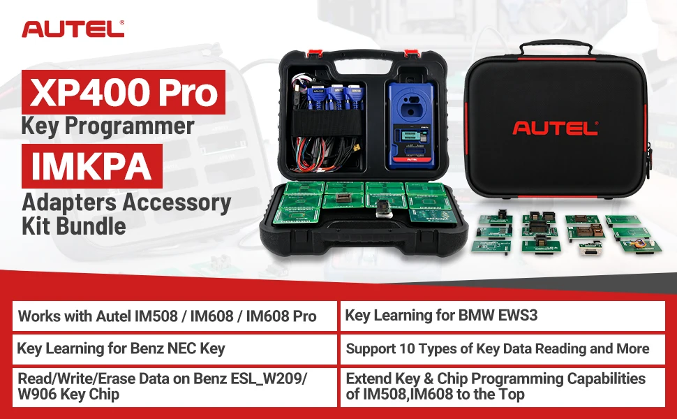 Autel IMKPA-это набор адаптеров для программирования, он может работать с XP400 Pro + IM508/ IM608(Pro)/ IM608PROKPA для улучшения функций IMMO для BENZ/ BMW / Adui/ VW и т. д. Например, ниже: