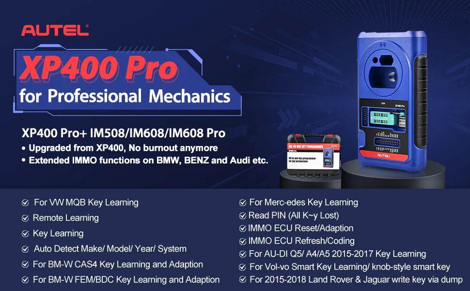 Autel XP400Pro-это замена XP400. Он добавляет больше функциональности для BM-W, Merc-edes-Be-nz, а также чтение EEPROM. С помощью новых протоколов конечный пользователь сможет читать более 2000 (чипы, компоненты, устройства) типов, включая EEPROM и MCU read, дополнительные одометр чтения/записи и многое другое. Кроме того, добавлены функции для EWS3, W209, NEC и многое другое. Примечание: Не подключайте AUTEL XP400 Pro напрямую с вашим автомобилем или он будет поврежден.