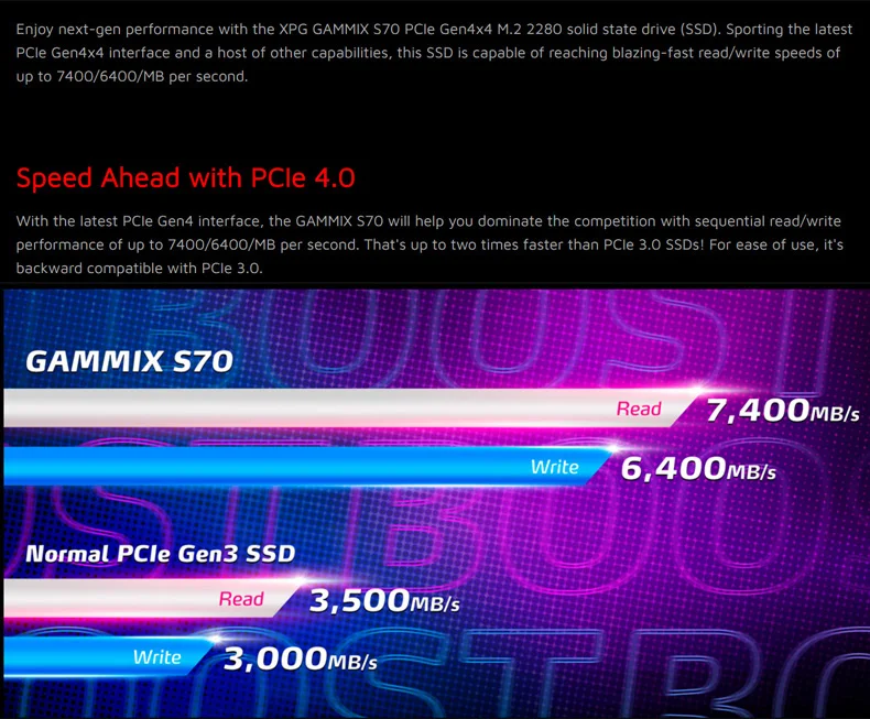 С новейшим интерфейсом PCIe Gen4, лезвие GAMMIX S70 поможет вам играть в соревнованиях с последовательной производительностью чтения/записи до 7400/6800/Мб в секунду. Это в два раза быстрее, чем SSD PCIe 3,0! Для удобства использования, он обратно совместим с PCIe 3,0.