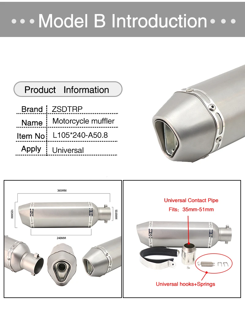 Это универсальный глушитель, который используется для велосипеда грязи, уличного велосипеда, скутера, квадроцикла и любого другого велосипеда