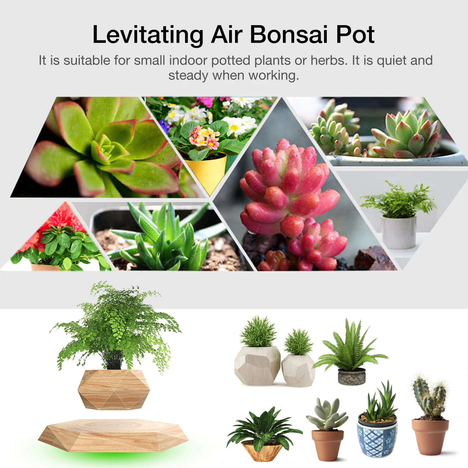 1. Левитирующий воздушный горшок бонсай: Этот Магнитный Волшебный плавающий горшок бонсай будет плавать в воздухе, потому что он поддерживается запатентованной технологией магнитной левитации, и он не будет шуметь во время вращения.5. Широкое Применение: подходит для украшения садов, столов, книжных полок, обеденных столов, гостиных, основных залов и любого места.