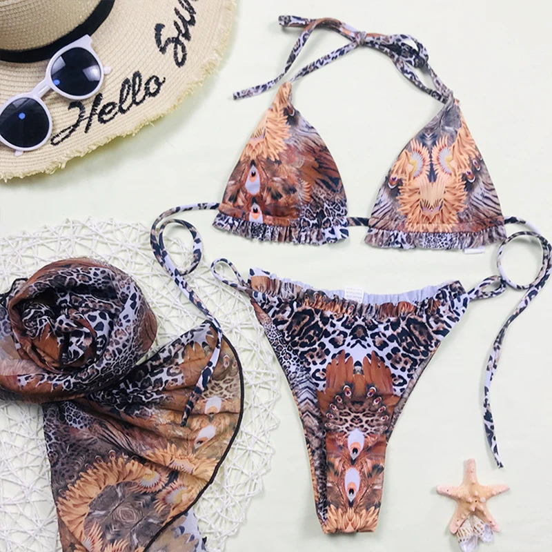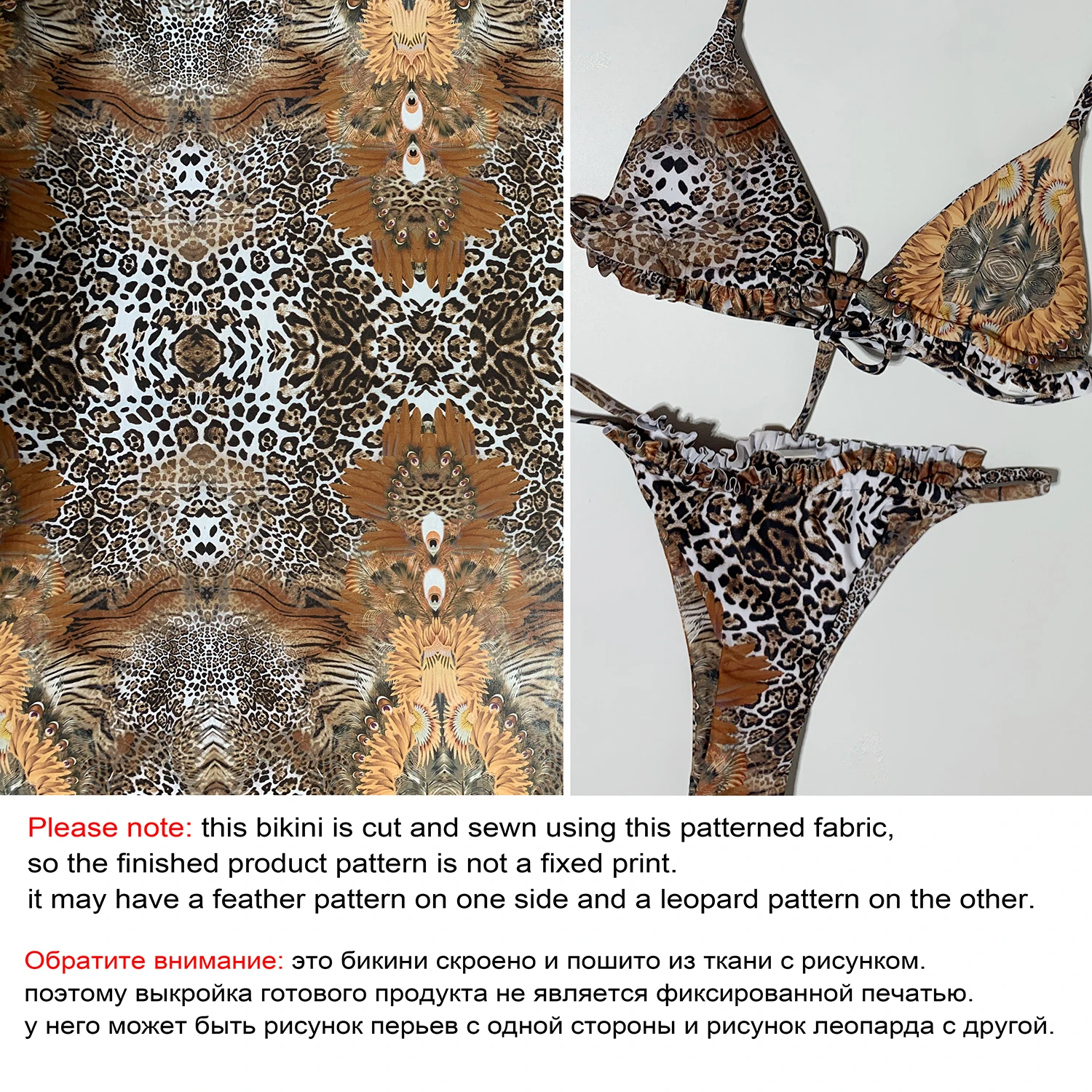 Это бикини обрезано и сшито с помощью этой узорной ткани. Таким образом, рисунок готового продукта не является фиксированным принтом. На одной стороне может быть узор из перьев и леопардовый узор на другой.