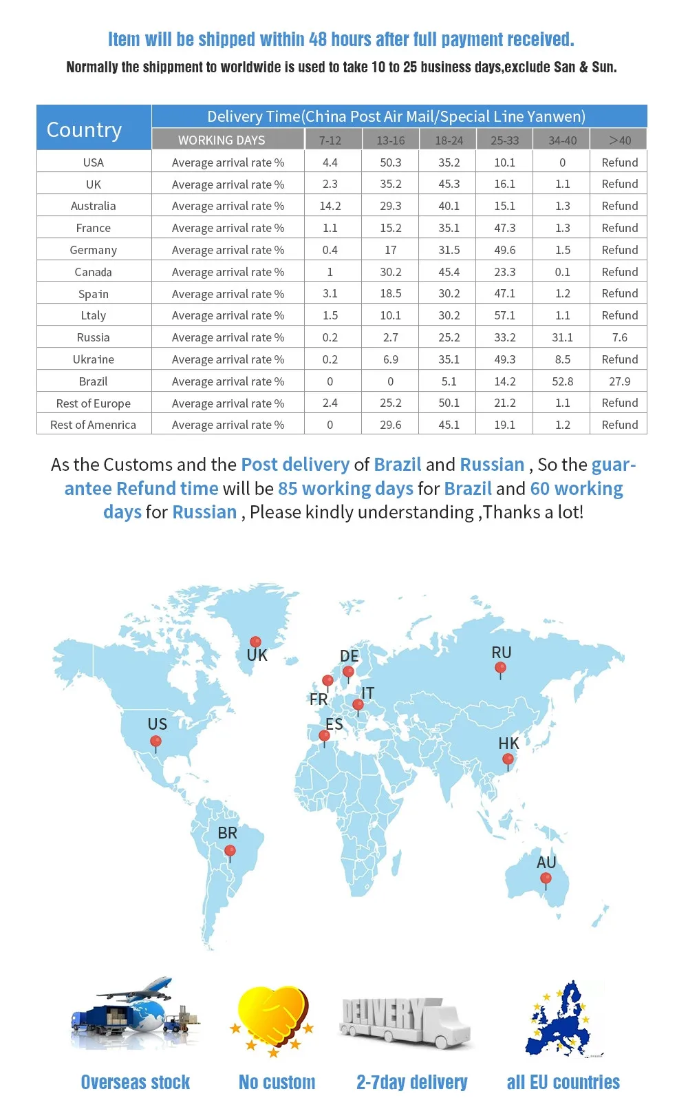 1, DOA 30 working days.2, All order do not accept refund for the non-compatible issue, please kindly confirm before buy! You also can contact with us for the compatible problem before buy.Delivery details:1, Delivery to Russia by Airmail: Generally 25~60 working days2, Delivery to Brazil by Airmail:Generally 30~90 working days3, Delivery to USA b y Airmail: Generally 10-20 working days.4, Delivery to Canada,AU, UK, and other European countries takes about 25-45 working days.If you need the item very urgently, please contact us for express shipping.If you have not got it within the shipping time, please no hesitate to contact us.We will check it for you with the post office and customs. Because sometimes it will be delayed for traffic or flight jams.Please do not open dispute to us.Please kindly note:Import duties, taxes and charges are not included in the item price or shipping charges. These charges are the buyer responsibility. The Lost due to undelivered address, it is responsibility for buyer.--Please check with your country customs office to determine how much these additional costs will be prior to purchasing. Terms of sales:Our goal is to make sure you are a happy buyer and pleasant shopping with us. Please email us before leaving any 1 or 2 ratings, negative feedback or open dispute, Negative feedback can't solve any problems.We will do our best to help you resolve the problems.Payment term:We accept the aliexpress payment only, do not accept any drop shipping. Please kindly make sure the address is correct before place the order.About us:We are the professional laptop parts supplier, the listing is do not including all our products, if you need any laptop parts or tool, could not find out from our store, please kindly send the message or contact with us online.Our Working Time:Monday to Friday(Chinese Holidays excluded)09:30 to 18:30( UTC+8 )All replies will be within 24 hours (Sat. & Sun. excluded) please kindly check your aliexpress accoun