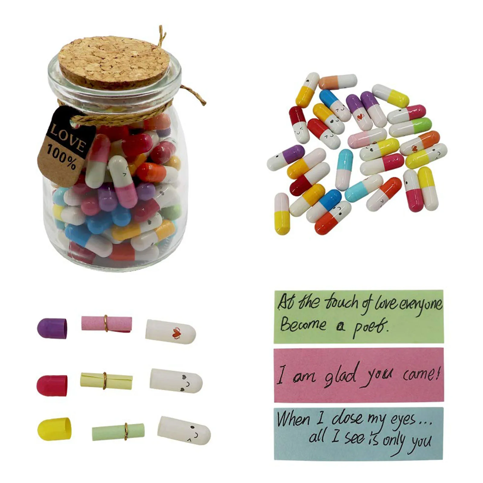 Милый и новый дизайн капсул для таблеток В таблетке есть пустой кусок бумаги, вы можете написать на нем все, что захотите Отличный способ показать свои чувства другим, если у вас нет смелости говорить Идеальный подарок для девушки или парня Сообщение в SMS? Как насчет сообщения в капсуле. Напишите секретную любовную ноту, чтобы вылечить ее/его разбитое сердце каждый день, каждый день. Посылка включает в себя: Вы получите 50 Милых Мини-капсул и 1 стеклянную бутылку для хранения. Высококачественные материалы-капсулы изготовлены из высококачественного желатина и бумаги. Внутри капсулы пустая бумага. Вы можете написать что угодно. Красивый дизайн узора: красивый дизайн узора и яркие цвета заставят друзей, которым понравится письмо, выразить свою любовь. Идеальный подарок: этот набор любовные капсулы милый и стильный и является дополнительным романтическим подарком. Сообщение на бутылке является хорошим инструментом для выражения любви и дружбы. Материал: пластик + бумага Цвет выбирается произвольно Размер упаковки: 14х10х7 см Общий Вес упаковки: около 210 г Упаковочный лист: Желая бутылка * 1 + таблеточная капсула (случайный цвет и случайный узор) * 50 шт