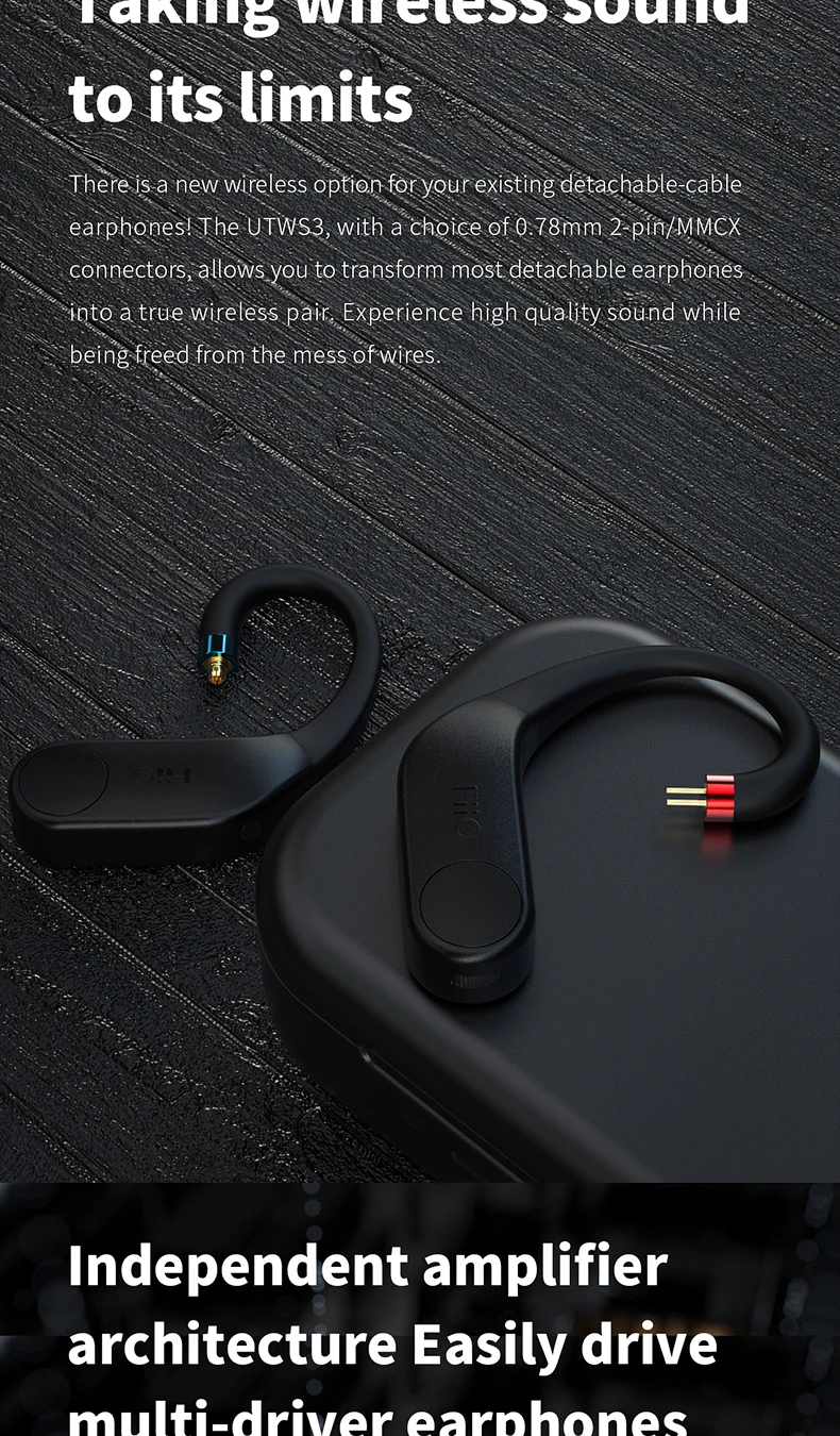 Новый беспроводной вариант для ваших существующих наушников со съемным кабелем! UTWS3 с выбором 0,78 мм 2-контактных/MMCX разъемов позволяет превратить большинство съемных наушников в настоящую беспроводную пару. Ощутите высокое качество звука, освободившись от беспорядка проводов.