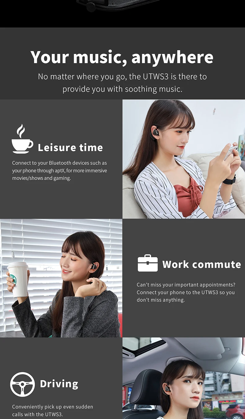 Благодаря технологии двойной передачи TWS + на UTWS3 нет основного и вторичного наушников-оба устройства являются основными и напрямую подключены к устройству Bluetooth. Это означает меньшую задержку, более сильное сопротивление помехам и в целом более стабильное соединение.