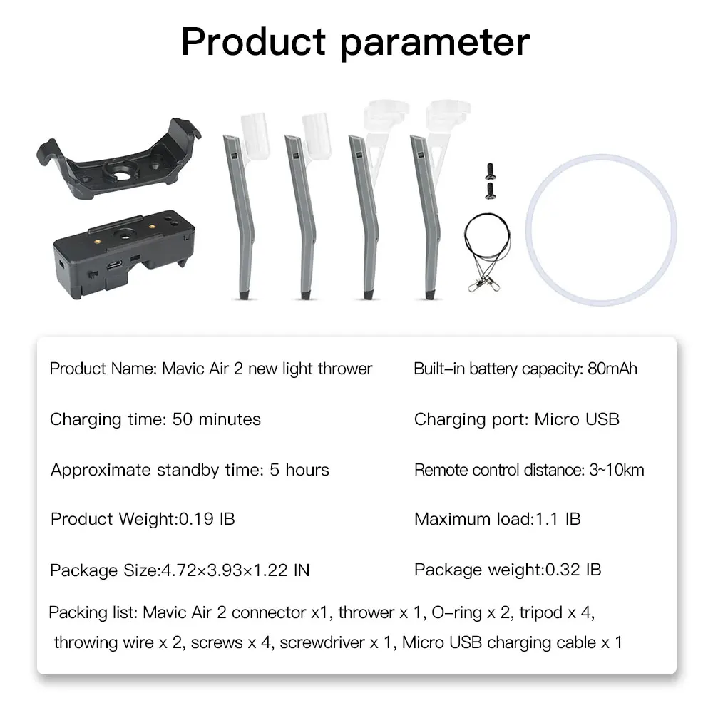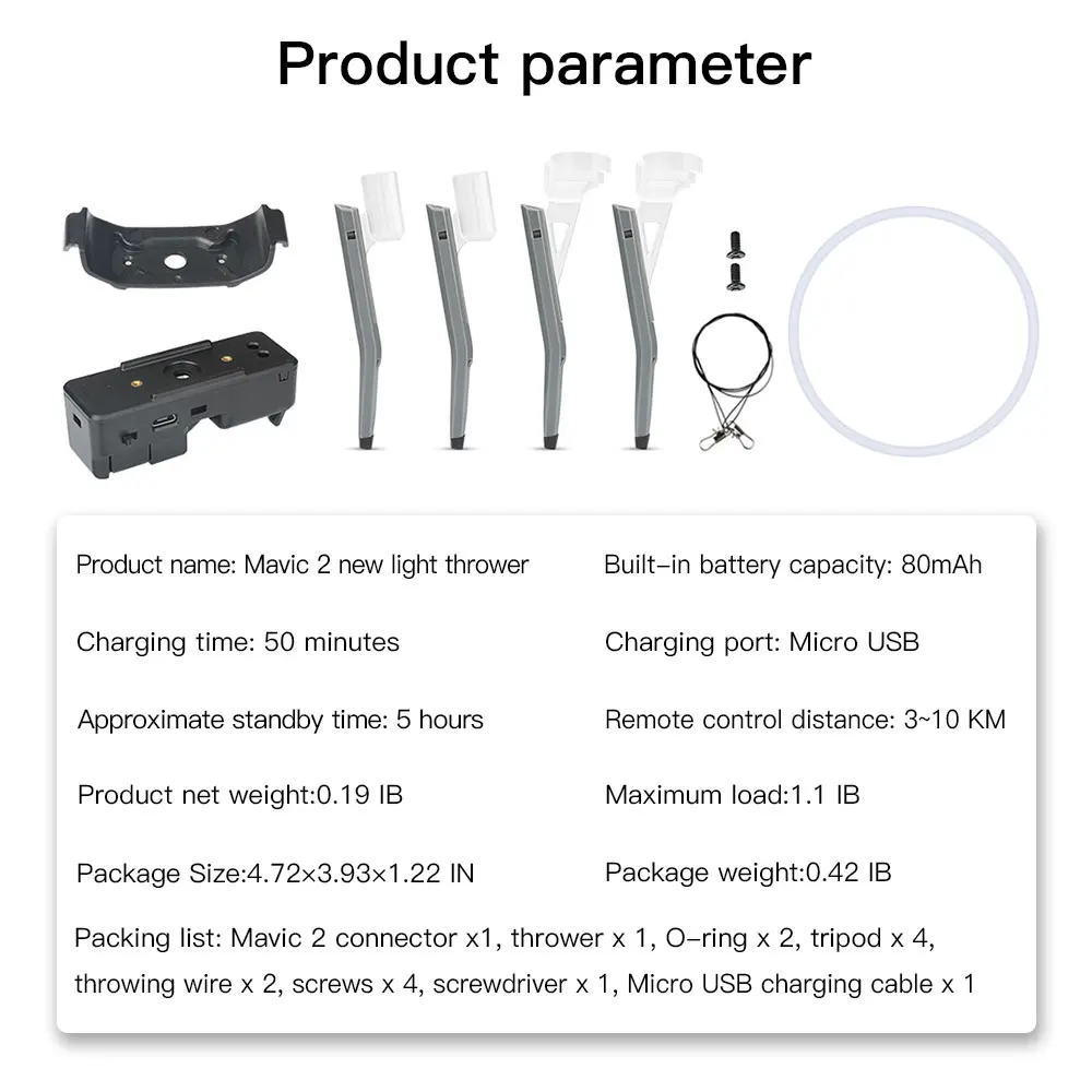 1. Емкость аккумулятора: 80 мАч, 2. Время использования: 5 часов, 3. Время зарядки: 50 минут, 4. Вес изделия: 44,4 г,5. Можно установить предметы в пределах 90 г,6. Расстояние дистанционного управления: 30-40 м