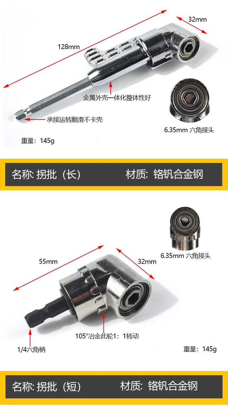 Функция: его можно подключить к электрической дрели, перезаряжаемой электрической дрели или ручному гаечному ключу, выдвигаясь в узкое пространство, до которого они не могут дотянуться, Закручивая винты и гайки.