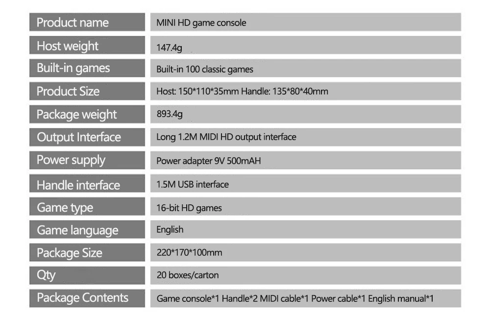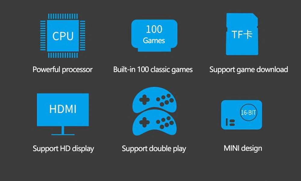 Мощный процессор Встроенные 100 классических игр Поддержка загрузки игр Поддержка hd-дисплея Поддержка двойной игры Мини-дизайн