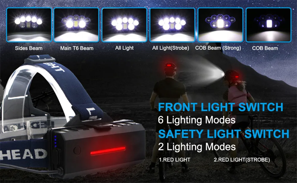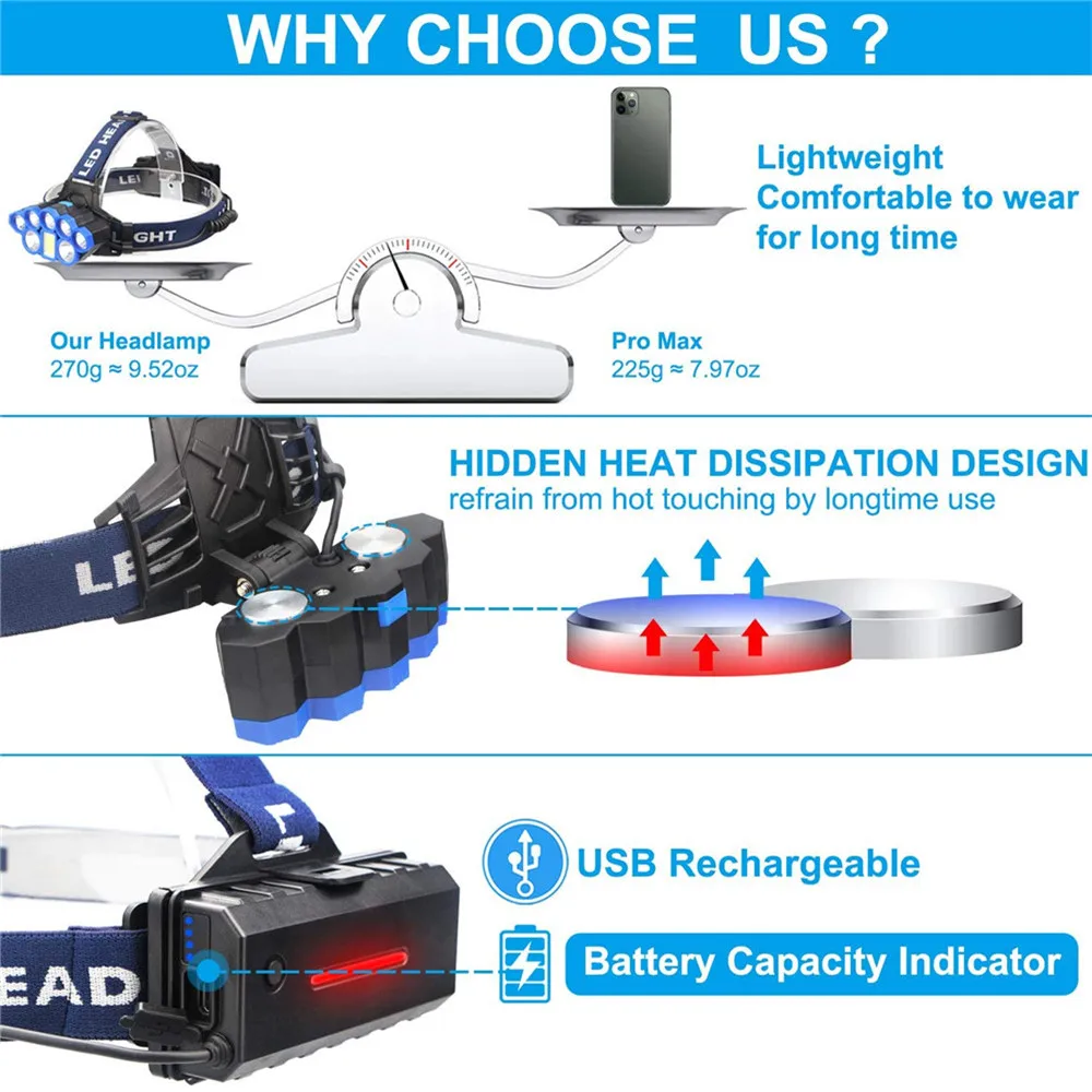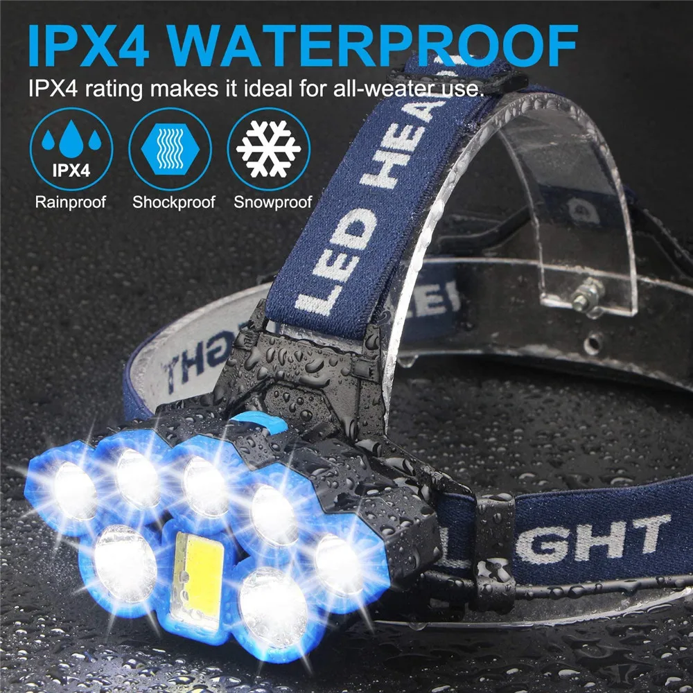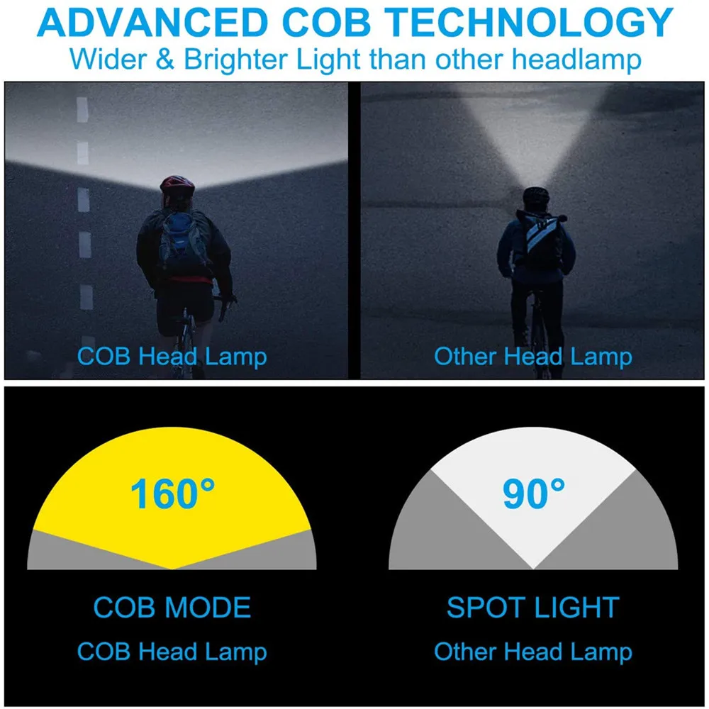 🔦【Real COB Technology Headlamp】-светильник для вспышки фары состоит из 7 светодиодный ламп + 1 большой встроенный СВЕТОДИОДНЫЙ модуль COB, дальность освещения 500 метров; супер яркий фонарь COB с почти 180 ° широким лучом производит яркий, ровный, рассеянный светильник с меньшим количеством теней, чем точечные лучи, идеально подходит для ремонта автомобиля, охоты, кемпинга, Пешие прогулки, прогулки собаки