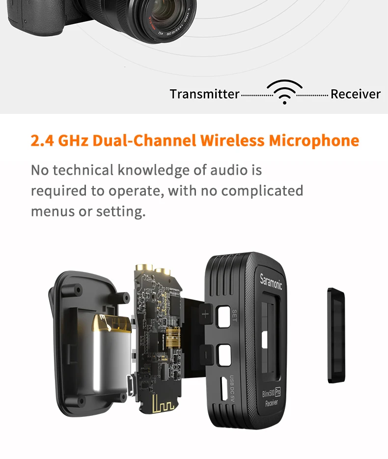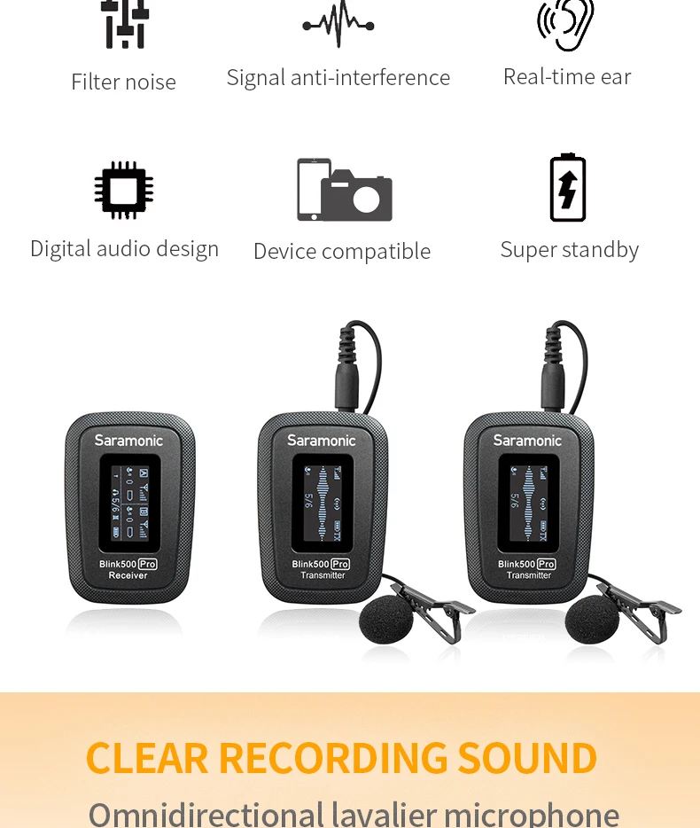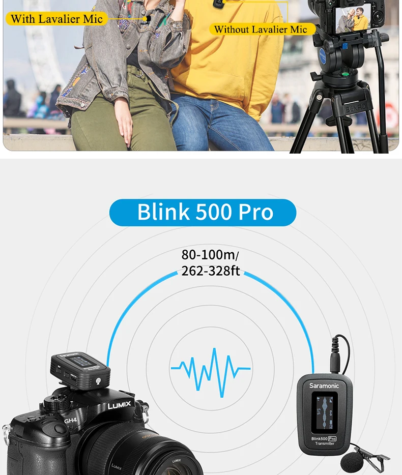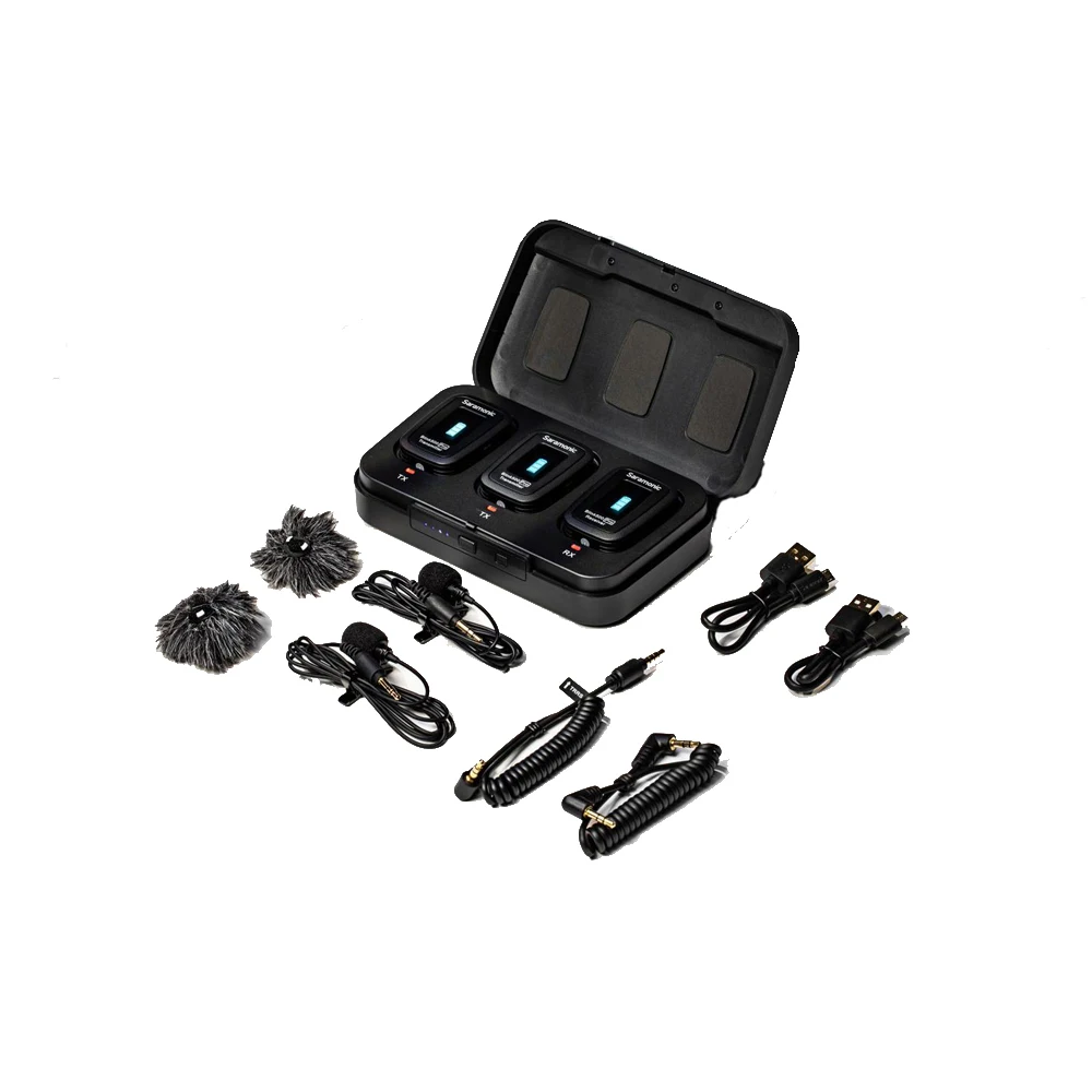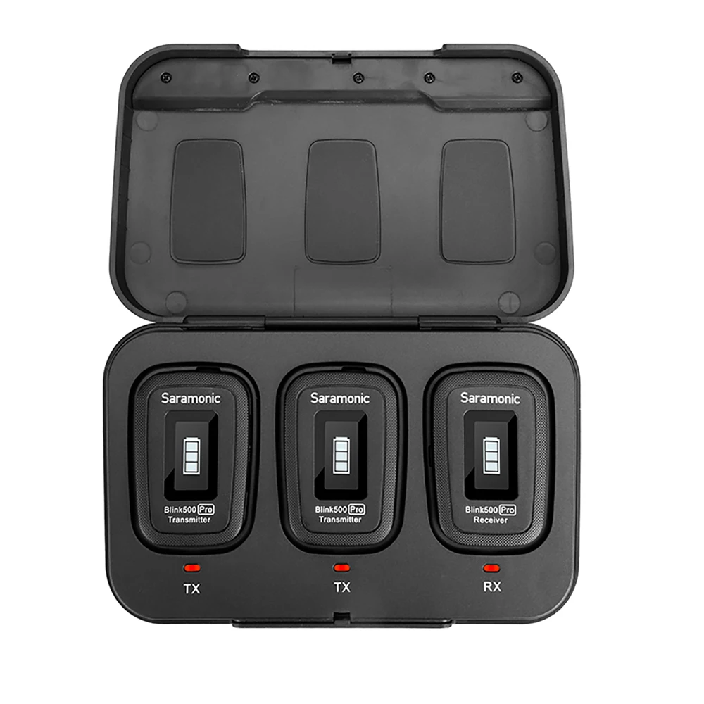 Saramonic мигать 500 Pro B2 является передовым 2,4 GHz dual Беспроводная система, которая обеспечивает звездной, пригодные для трансляции звука для 2-люди к камерам, мобильных устройств и т. д. Идеально подходит для интервью и общения 2 человек от вещателей, подкастеров, vloggers, livestreamers, создателей YouTube и кинематографистов. Этот ультра-портативный и легкий двойной набор микрофона поставляется с двумя (2) беспроводными передатчиками с зажимом со встроенным микрофоном, двумя (2) микрофонами класса pro lavalier, двухканальный приемник и портативный зарядный чехол для переноски. Приемник поставляется с выходными кабелями TRS и TRRS и легко скользит в башмак крепления камеры или клетки. Он настолько компактный и легкий, что вы даже можете прикрепить его к смартфону, планшету или даже к ремешку для камеры. Позволяет легко использовать беспроводной микрофон для двух человек.