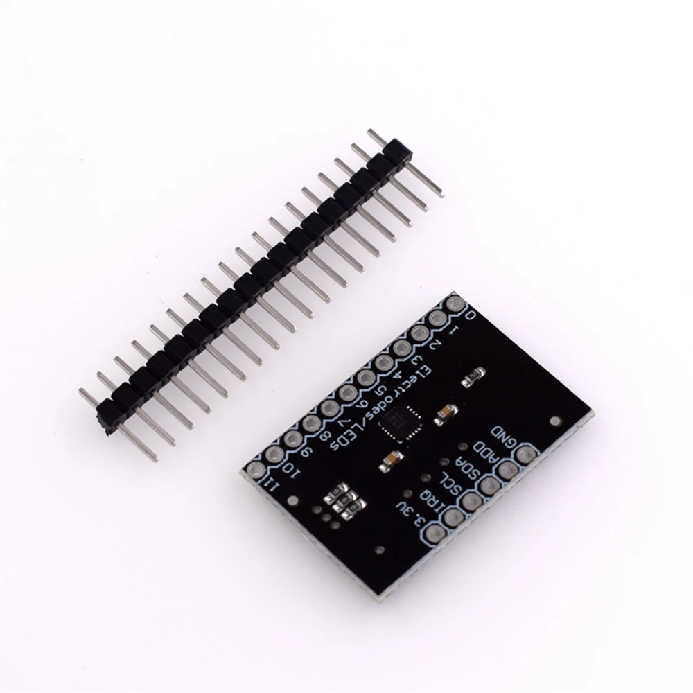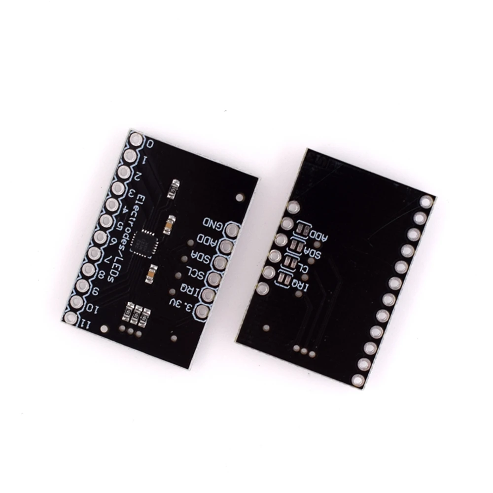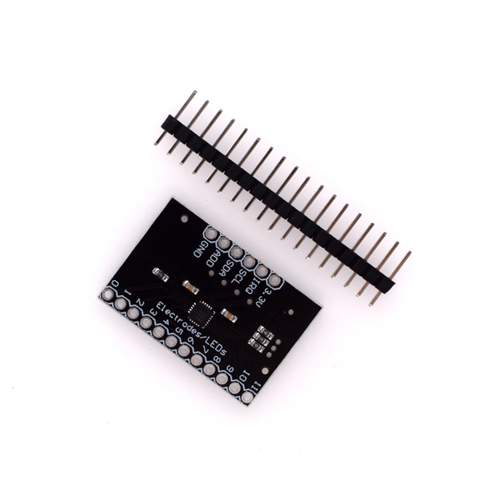 Это breakout board для Freescale's MPR121QR2. MPR121-это емкостный сенсорный контроллер, управляемый интерфейсом I2C. Чип может управлять до двенадцати отдельными электродами, а также имитацией тринадцатого электрода. MPR121 также имеет восемь светодиодный штифтов для вождения. Когда эти контакты не настроены как электроды, они могут использоваться для привода светодиодов. В нижней части доски есть четыре перемычки, все из которых по умолчанию установлены (закрыты). Адресная Перемычка прикрепляет штифт к земле, что означает, что по умолчанию I2C Адрес чипа будет 0x5A. Если вам нужно изменить адрес чипа (коротко нажав на другой штифт), сначала откройте перемычку. Перемычки также соединяют SDA, SCL и штырь прерывания с 10k выдвижными резисторами. Если вам не нужны выдвижной резисторы, вы можете открыть перемычки, обрезав трассировку, соединяющую их. Нет регулировки на доске, таким образом, напряжение поставляется должна быть в пределах 2,5 и 3.6VDC. В VREG pin подключается через 0,1 мкФ этому штекеру конденсатор на земле, что означает, что, за исключением случаев, когда вы измените доска, вы не можете управлять MPR121 с низким уровнем напряжения питания режим (1,71-2.75VDC). Размер: 3 см x 2 см.