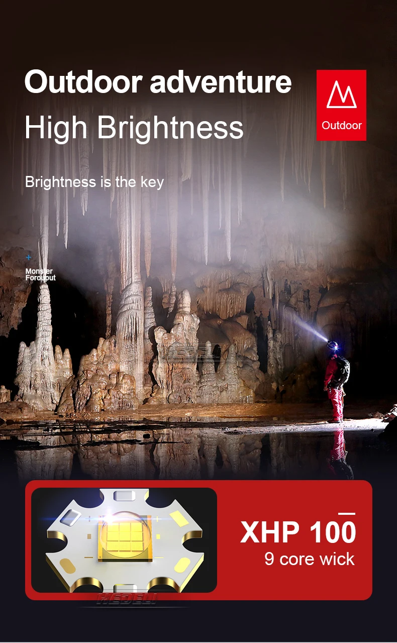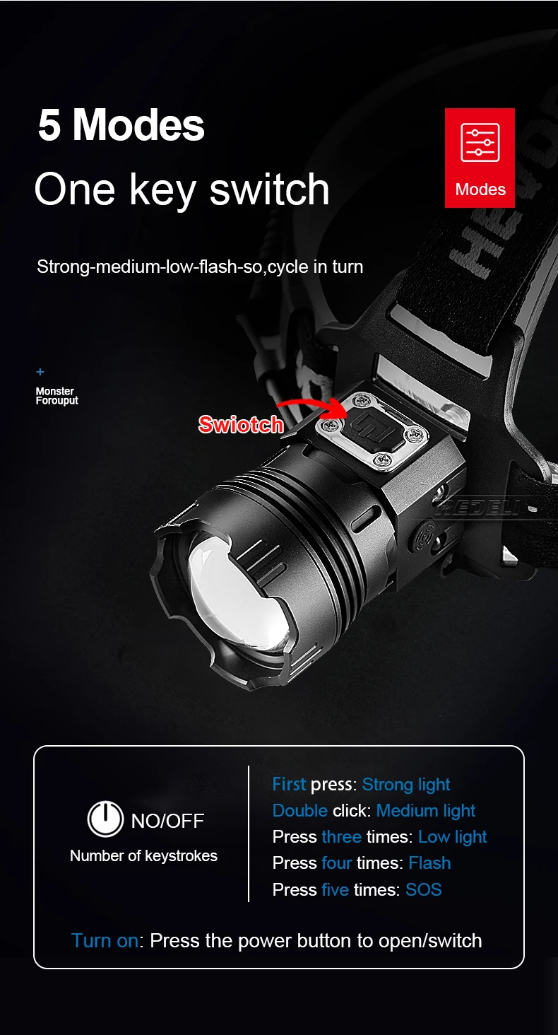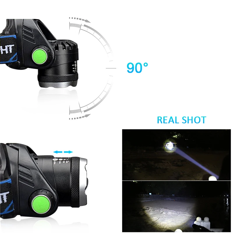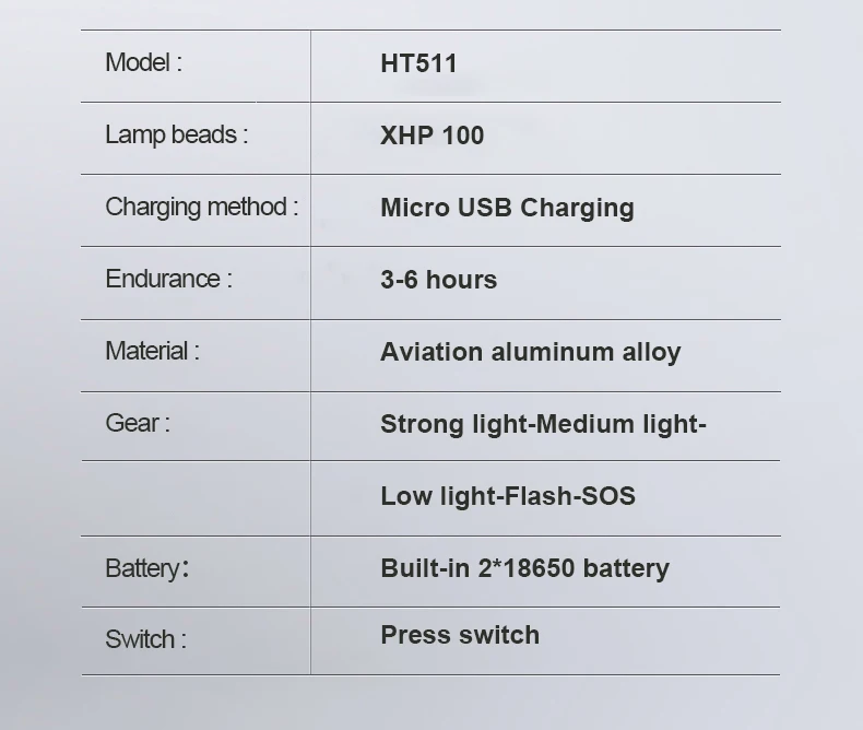 ПOwerПолноцветный светодиодный светильник использует новейший светодиодный светильник xhp100, Максимальный световой поток-600000 5 режимов: высокий/средний/низкий/Стробоскоп/SOS (прост в использовании в различных сценариях) Телескопический зум, сфокусированный светильник используется для дальнего светильник, яркий на больших расстояниях. Зум-светильник, wДиапазон освещения ide Умный индукционный дизайн. Свободные руки, может выключить свет даже занят ИспользованиеВстроенный 2*18650Аккумулятор (аккумулятор большой емкости 18650, более прочный, чем обычный аккумулятор 18650) 4 уровня отображения мощности (25%, 50%, 75%, 100%), оставшаяся мощность хорошо видна Выход USB (5 В 2 а), может быстро заряжать мобильные телефоны или другие электронные продукты 5 В Вход Micro USB, подходит для компьютера USB, автомобиля USB, другие USB вилки для зарядки Регулируемый ремешок для фар, легко надевать и снимать, подходит для всех Водонепроницаемый класс соответствует IPX-6, может использоваться в дождливые дни, но не может быть помещен в воду Изготовлен из авиационного алюминиевого сплава, прочный HAIII военный Жесткий анодированный КостюмLeДля работы, прогулок, кемпинга, рыбалки, патрулирования, Скалолазание и другие виды деятельностиПараметры продукта