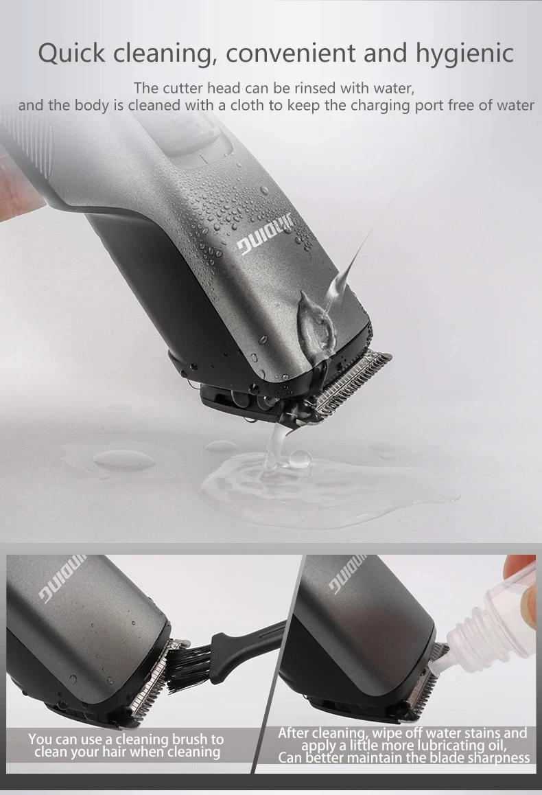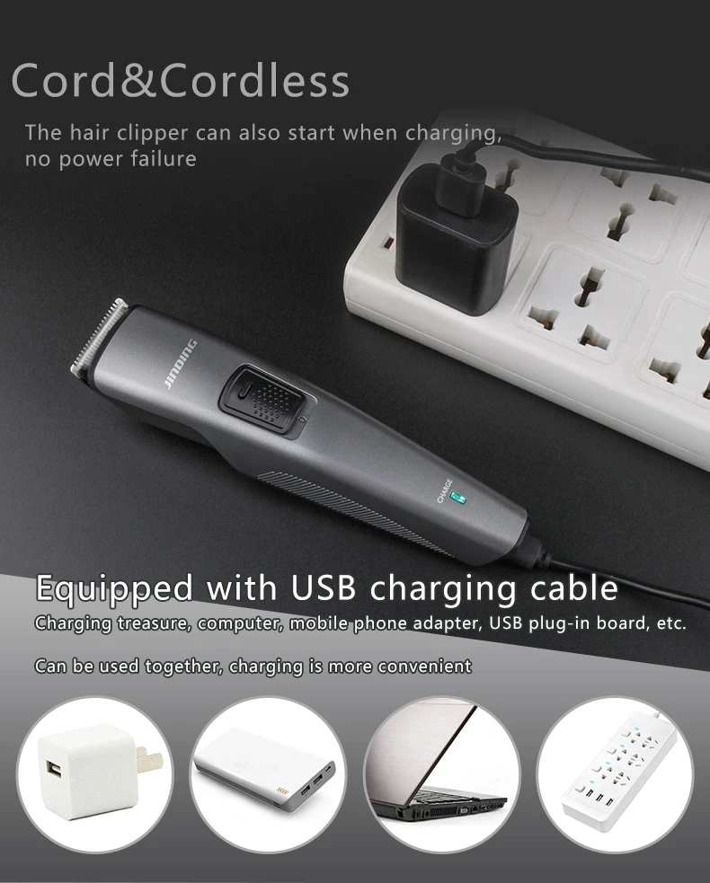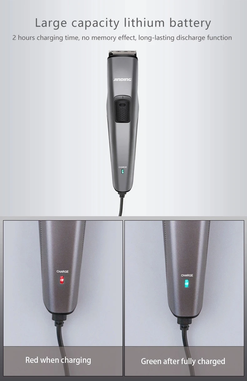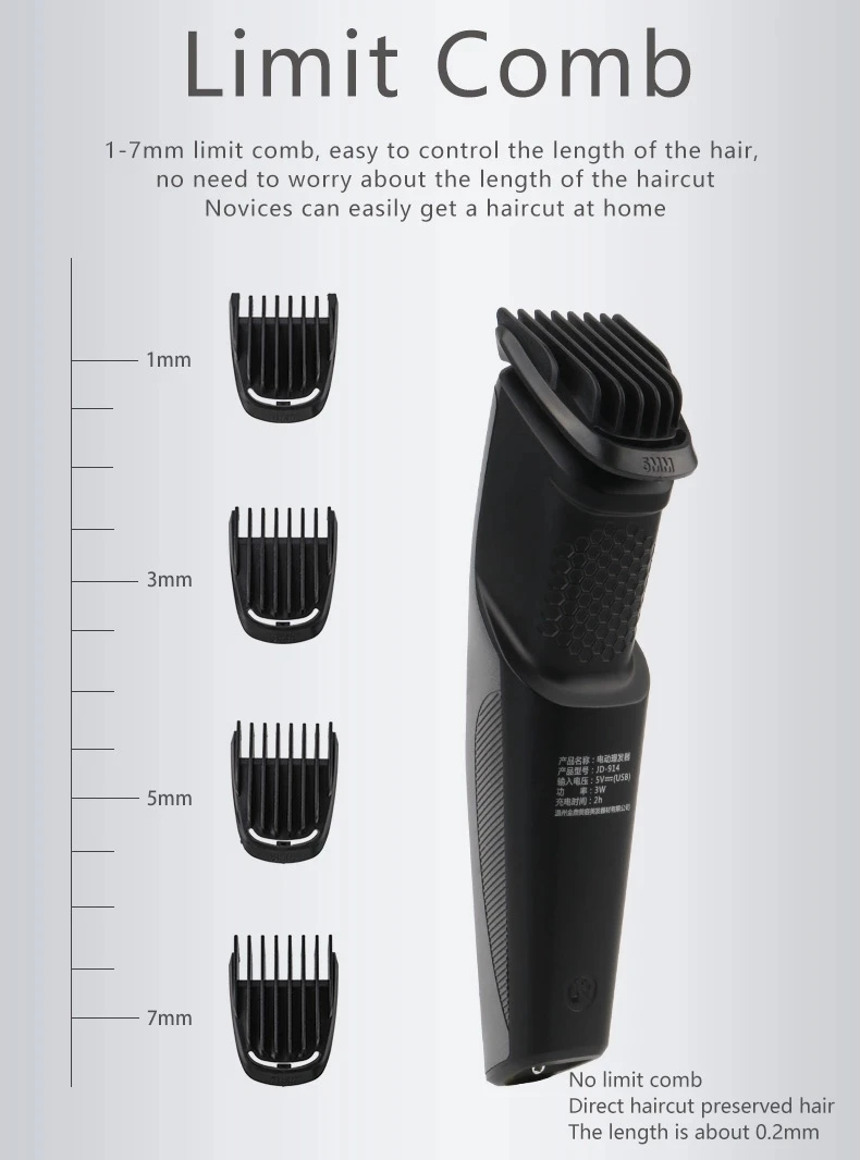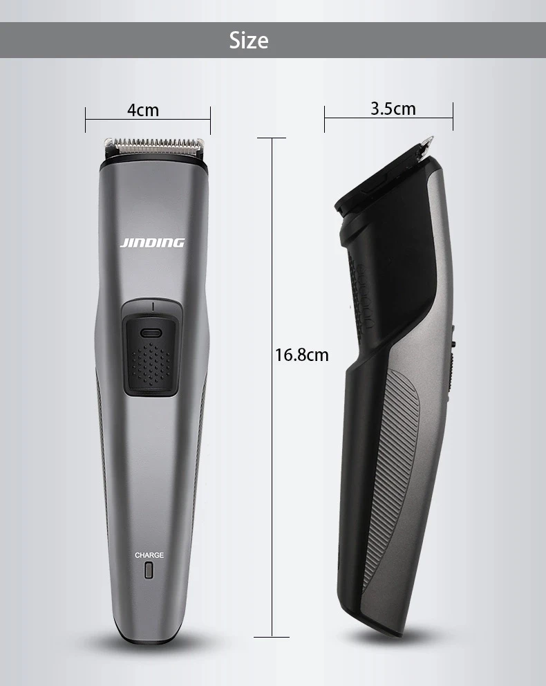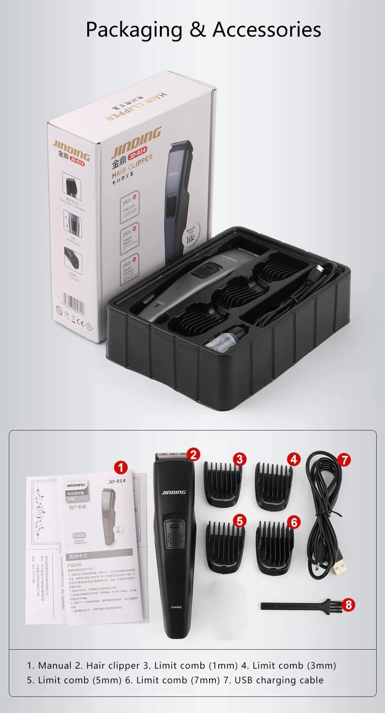Модель: YJ173 Iuput напряжение: 100v ~ 240v Мощность: 3 Вт Материал: нержавеющая сталь Время зарядки: 1,5 часов Время использования: 120 минут Батарея: литиевая Концевая расческа: 4 шт. Вес: 440 г