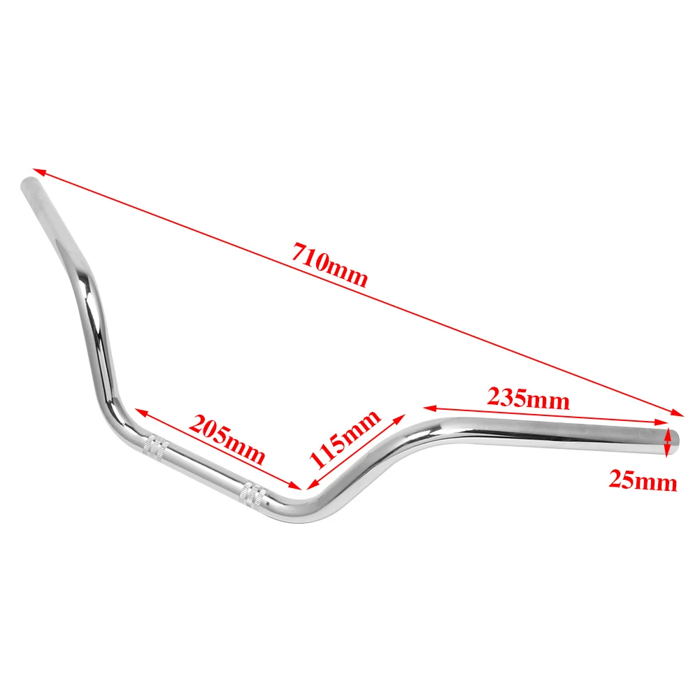 Особенности: Яркий и простой дизайн удобен и создан для производительности Размеры: как показано на изображении Материал: железо Цвета: черный/хром Комплектация: Универсальный для Harley Honda Yamaha Suzuki Kawasaki Triumph Most Chopper Cruisers Bobber Bike или любых других пользовательских применений с рулем 7/8 дюйма 22 мм Примечание: замеры сделаны вручную, поэтому возможны отклонения на 1-1,5 см. Посылка входит: 1 шт. руль