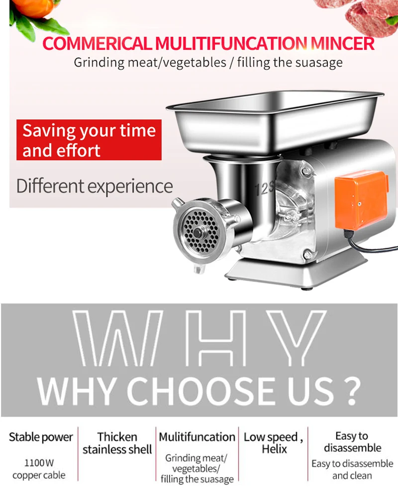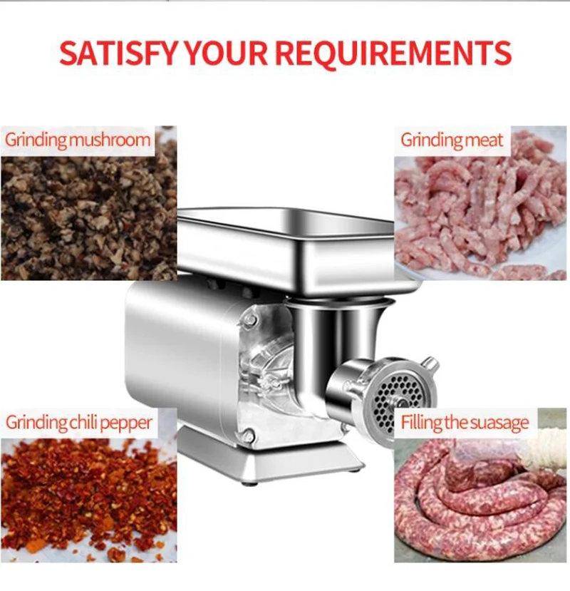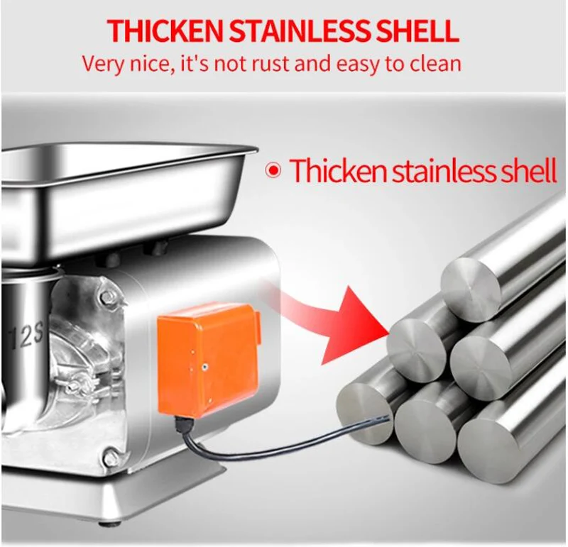 Название продукта: настольная электрическая мясорубка Мощность: 1100 Вт Напряжение: 110 В/220 В Производственная мощность: 150 кг/ч Оснащен сеткой для ножей: 2 шт. По умолчанию диаметр нетто ножа: 6 мм/8 мм Вес: 25 кг Размер: 290*300*350 мм