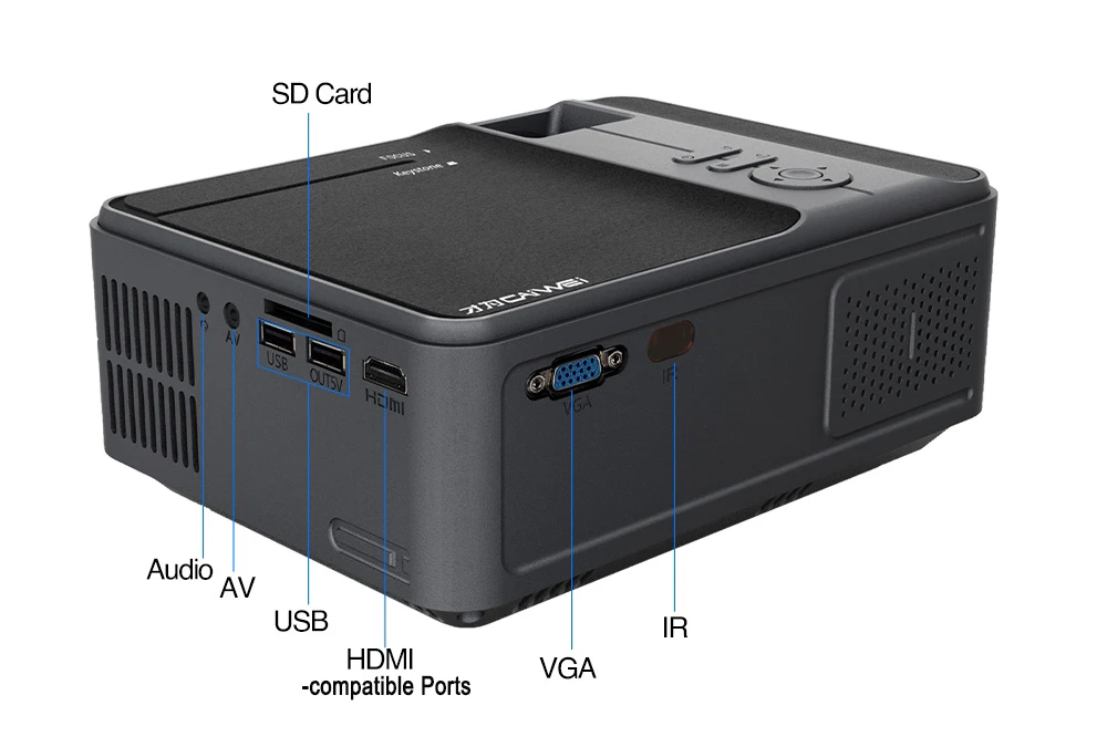 Этот светодиодный проектор оснащен hdmi-входом для ТВ-палки, игровых консолей, Chromecast, ПК, ноутбуков, dvd-дисков и т. Д. Он также имеет вход VGA и вход USB/Micro SD/AV, а также выход 3,5 мм mini jack.