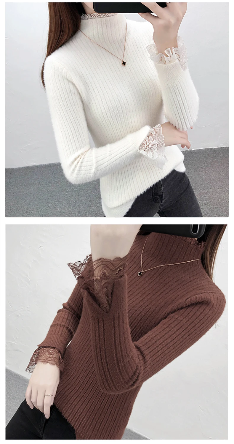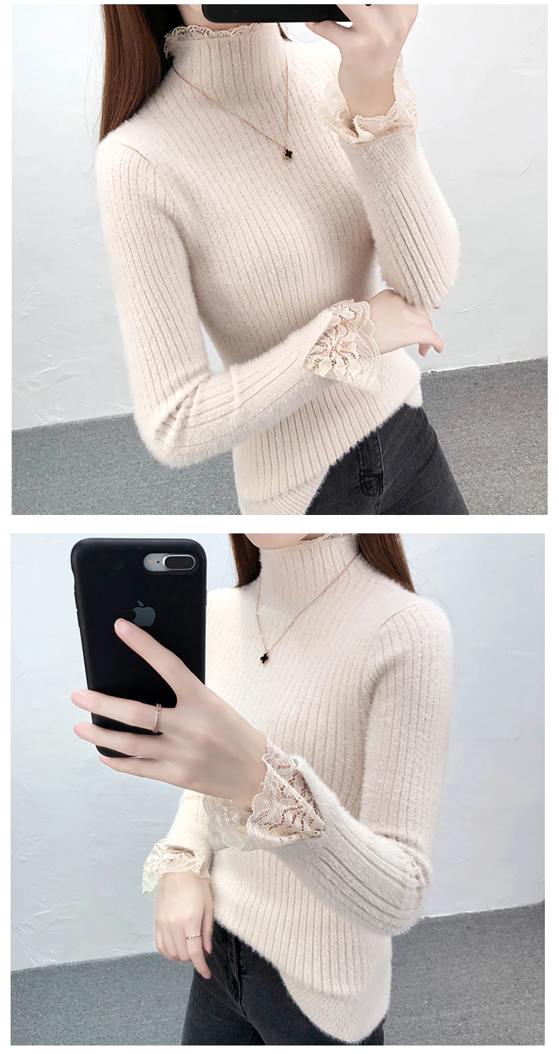 Свитер кашемир с норкой женский корейский базовый Водолазка пуловер свитер осень зима кружева белый синий розовый Теплый вязаный свитер