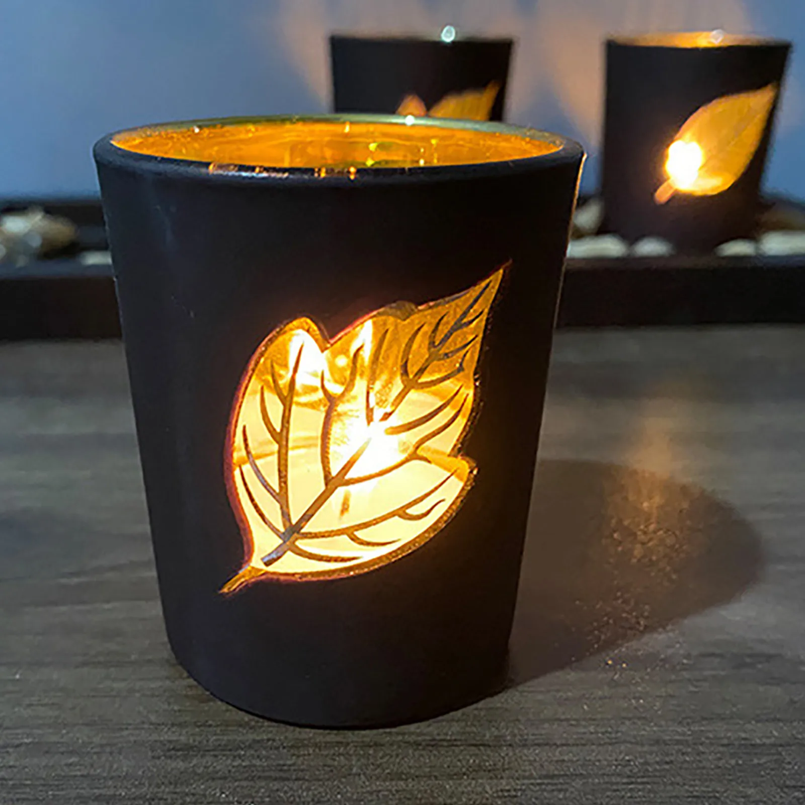 Три стеклянных подсвечника, ветрозащитные и красиво декорированные.