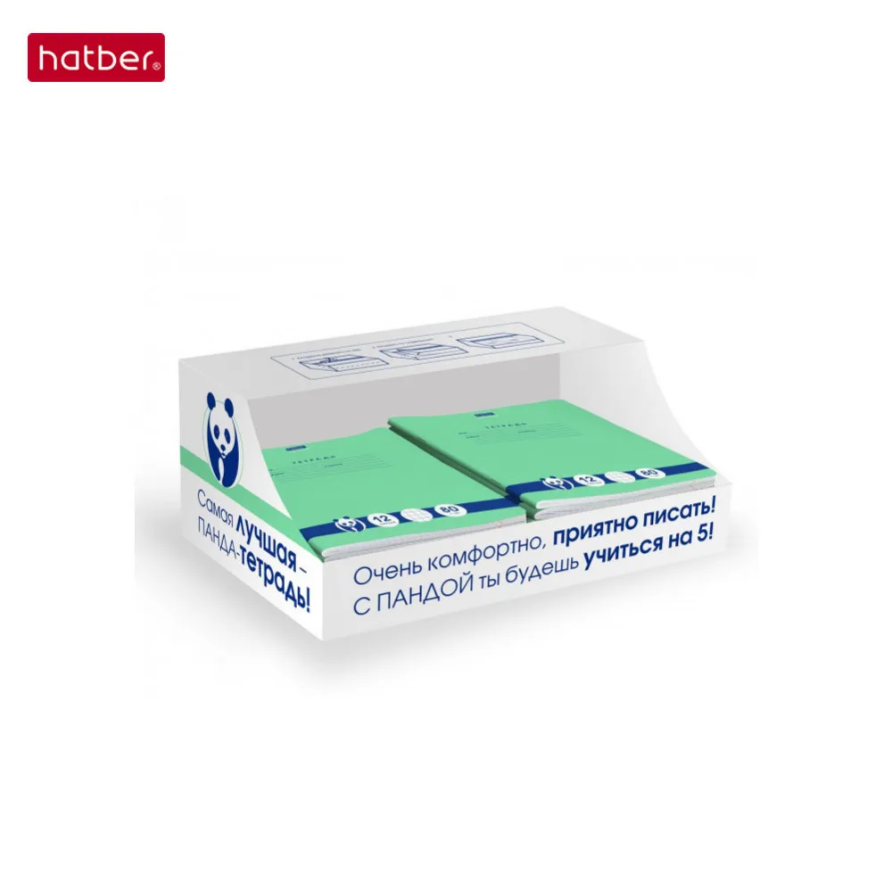 Тетради упакованы в картонную транспортную коробку. На ней имеется перфорация для частичного отрыва верхней крышки, за счет которой коробка без особых усилий превращается в удобный шоу-бокс для выкладки тетрадей на полках магазинов.