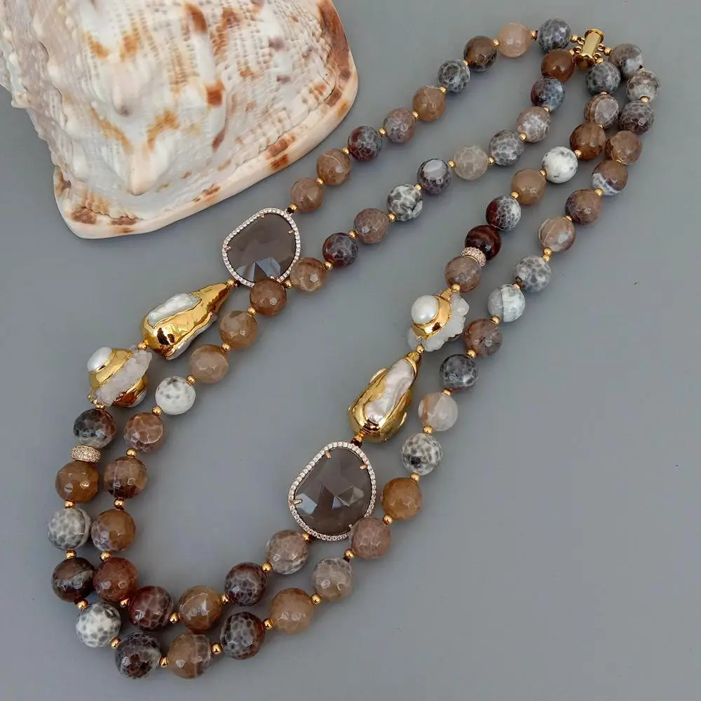 2 нити граненый коричневый Агат Кристалл Жемчуг Кварц ДрузаОжерелье 21"