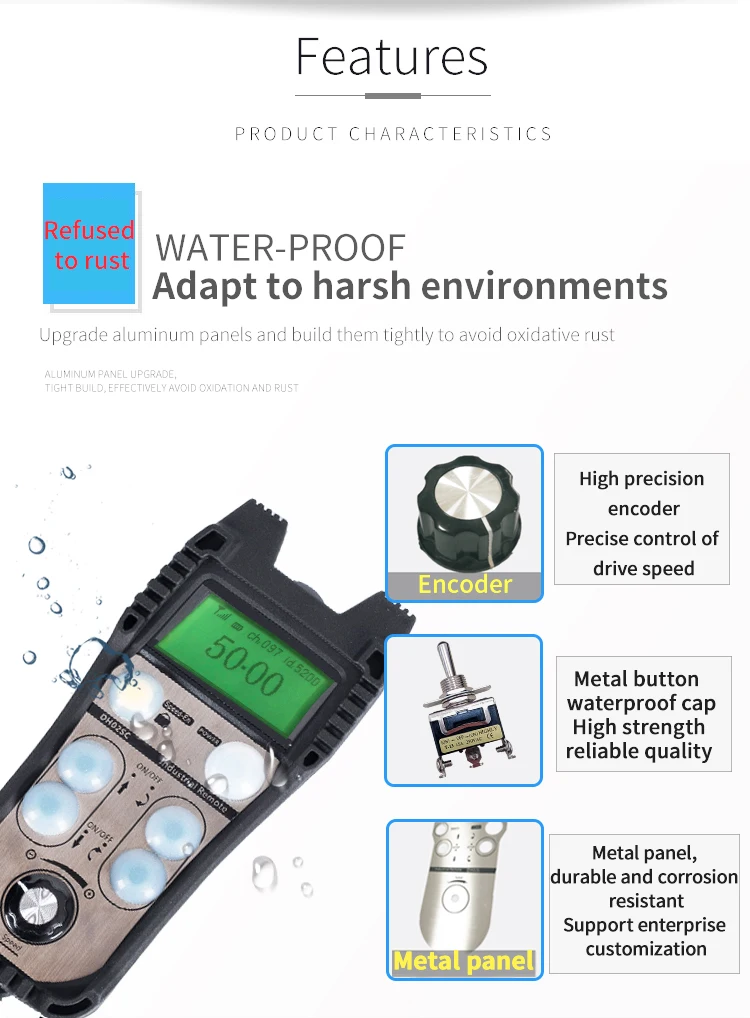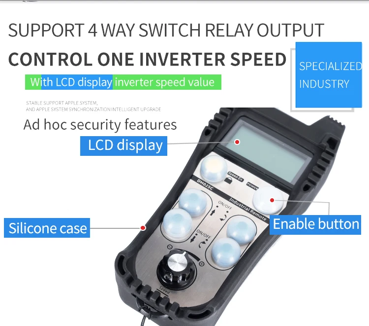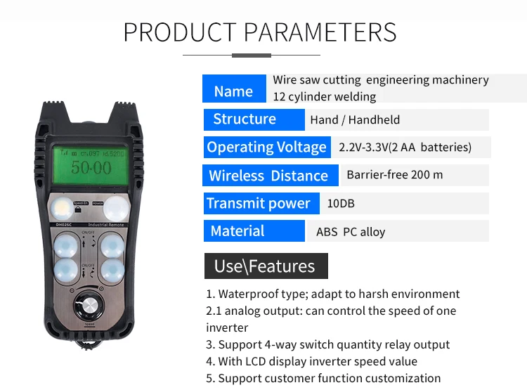 1. Используйте частоту беспроводной передачи 433 МГц. Технология беспроводной скачки частоты на большие расстояния. Дистанция беспроводного управления 200 м без барьера 2. В той же рабочей зоне, он может поддерживать 32 шт оборудования, используемых одновременно 3. ЖК-монитор может отображать текущий сварочный ток, напряжение и скорость 4. Поддержка 4 линии 250v/3A релейный выход. Для того, чтобы Управление контактор переменного тока для достижения мотор часовой стрелке/счетчик-часы 5. Поддержка 1 линии 0-10 в аналоговый выход напряжения для управления регулировкой скорости VFD 6,1 линия нормального открытия сигнала E-stop 7. Низкое энергопотребление, 2 батарейки AA могут использовать 1 месяц в норме