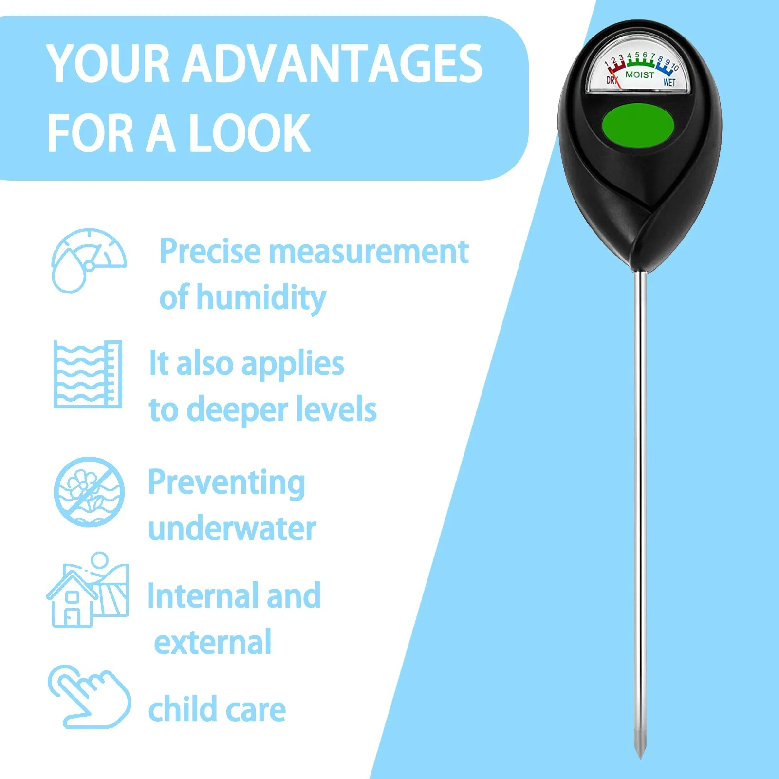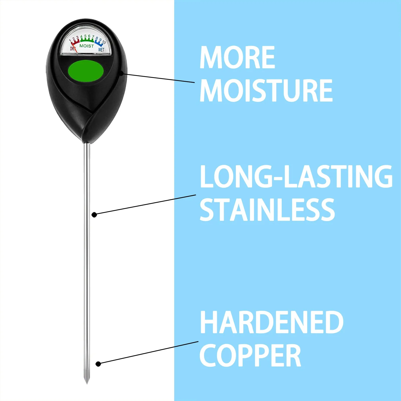 Описание товара: Точная влажность почвы-наш Улучшенный измеритель влажности определяет точную влажность почвы и обеспечивает Здоровый и сильный рост вашего растения. Таким образом, вам не придется беспокоиться Больше! Батареи не нужны-нет Батареи необходимы для нашего Wendowerk измеритель влажности. Это делает почву Тестер чрезвычайно экологически чистый и может быть использован немедленно! Для использования в помещении и на улице -Благодаря универсальным функциям и чрезвычайно длинному измерительному стержню, Измеритель влажности подходит для растений, комнатных растений, газонов, поднятых кроватей И многое другое! Для почти всех поверхностей- Из-за чрезвычайно прочной нержавеющей стали W43, наш измеритель влажности Подходит практически для всех поверхностей. Таким образом, вы можете легко определить точную почву Влажность в любом месте! Меньшее повреждение корней растений -Конструкция одной иглы вызывает меньшее повреждение корней растений при вставке В почву. Когда тестовый зонд вытягивается, он не выносит много Почвы.Применение: