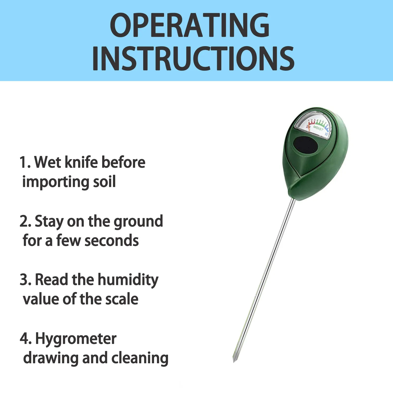 Шаг 1: вставьте зонд В почву глубиной около 5-10 см. Шаг 2: Отрегулируйте Положение зонда до тех пор, пока указатель на шкале не выключится. Шаг 3: через 10 минут Обратите внимание на влажность на циферблате. Шаг 4: Вытяните зонд Земли и вытереть его после каждого использования.Советы: