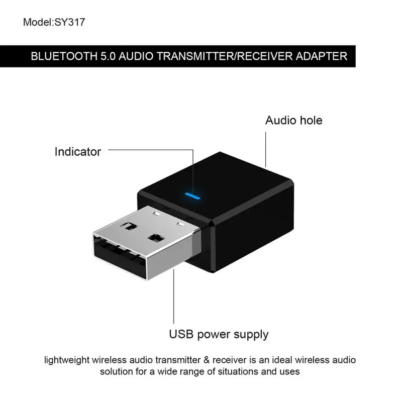 A) использование режима приема: синий светодиодный индикатор мигает, показывая, что он переключился на режим приема. Usb этого продукта используется для источника питания. Напряжение питания составляет 5 В. Его можно подключить к любому usb-интерфейсу с выходом 5 В, например, к зарядному устройству на мобильный телефон 5 В. Имя сопряжения: SY317, найдите соединение SY317 в настройках Bluetooth телефона. Во время процесса сопряжения мигает синий светильник. После успешного сопряжения синий светильник перестает мигать и становится всегда ярким. В то же время, используйте 3,5 аудио кабель для подключения к товару Bluetooth-устройств, таких как проводные наушники, колонки, автомобильной аудиосистемы и т. д. Когда телефон воспроизводит песни, песни можно передавать без проводов на эти устройства.
