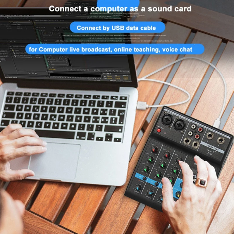 1. Миксер оснащен входным усилением и высокой и низкой регулировкой b, встроенный фантомный блок питания 48 В подходит для прямого источника питания конденсаторных микрофонов, выхода гарнитуры высокой четкости, mp3-плеер, bluetooth-приемник и подключенная звуковая карта ПК.