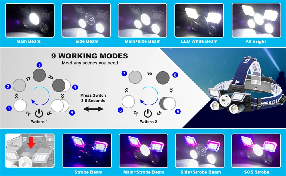 ✅【9 режимы работы на светильник и длительное нажатие кнопки options】 удерживание кнопки питания для «длительного нажатия» для перехода в следующий набор опций. Выберите основной светильник, два Габаритные огни светильник s, три точечный светильник, крупным планом светильник ing полным лучом, SOS,SOS + основной светильник, пятно света + строб, боковой светильник s + стробоскоп нажатием Кнопка. Эта головная лампа может поставить яркий и мощный светильник точно так, как вам нужно. Красный индикатор сзади может использоваться как светильник безопасности, чтобы предупредить бегуна на велосипеде или автомобиле.