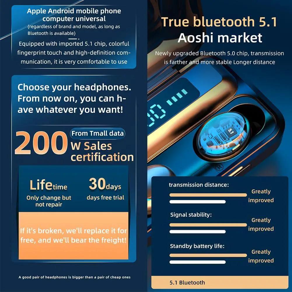 С емкостью зарядки 2000 мАч, длительный срок службы батареи. Интеллектуальный светодиодный цифровой дисплей, может отображать оставшуюся мощность наушников и зарядного устройства.