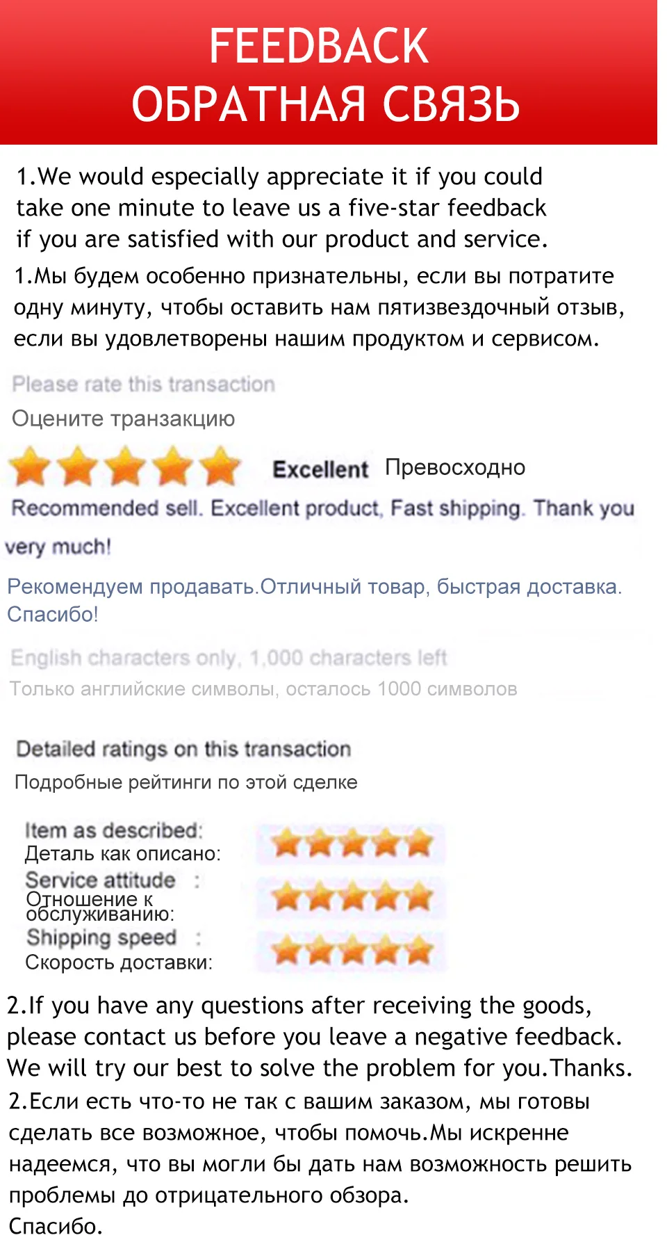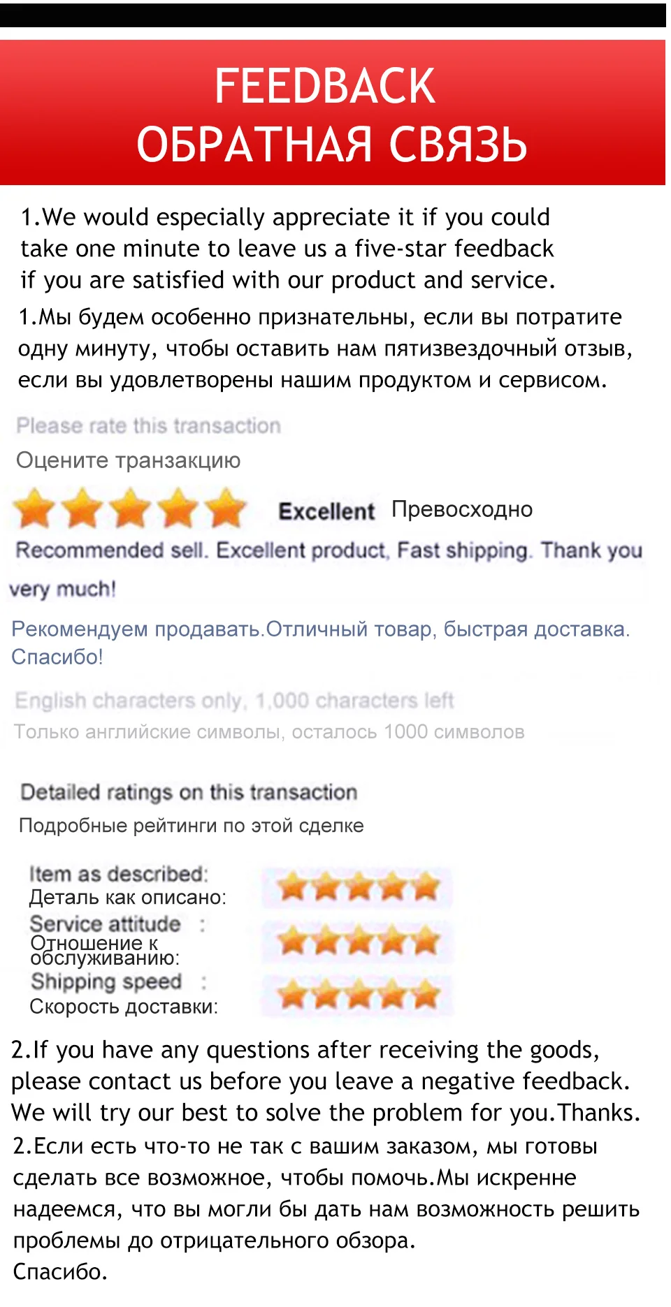 1) ваши отзывы очень важны для нас. Если вы удовлетворены нашими продуктами или услугами, пожалуйста, потратьте несколько секунд, чтобы оставить ценный Отзывы и дать нам пять похвал, большое спасибо! 2) Мы всегда предоставляем вам лучшие продукты и услуги по самой низкой цене. 3) Пожалуйста, свяжитесь с нами, прежде чем оставить нейтральный (3 звезды) или отрицательный (1-2 звезды) отзывы. Мы постараемся сделать все возможное, чтобы решить проблему и подарить вам приятную атмосферу покупок здесь. Большое спасибо!