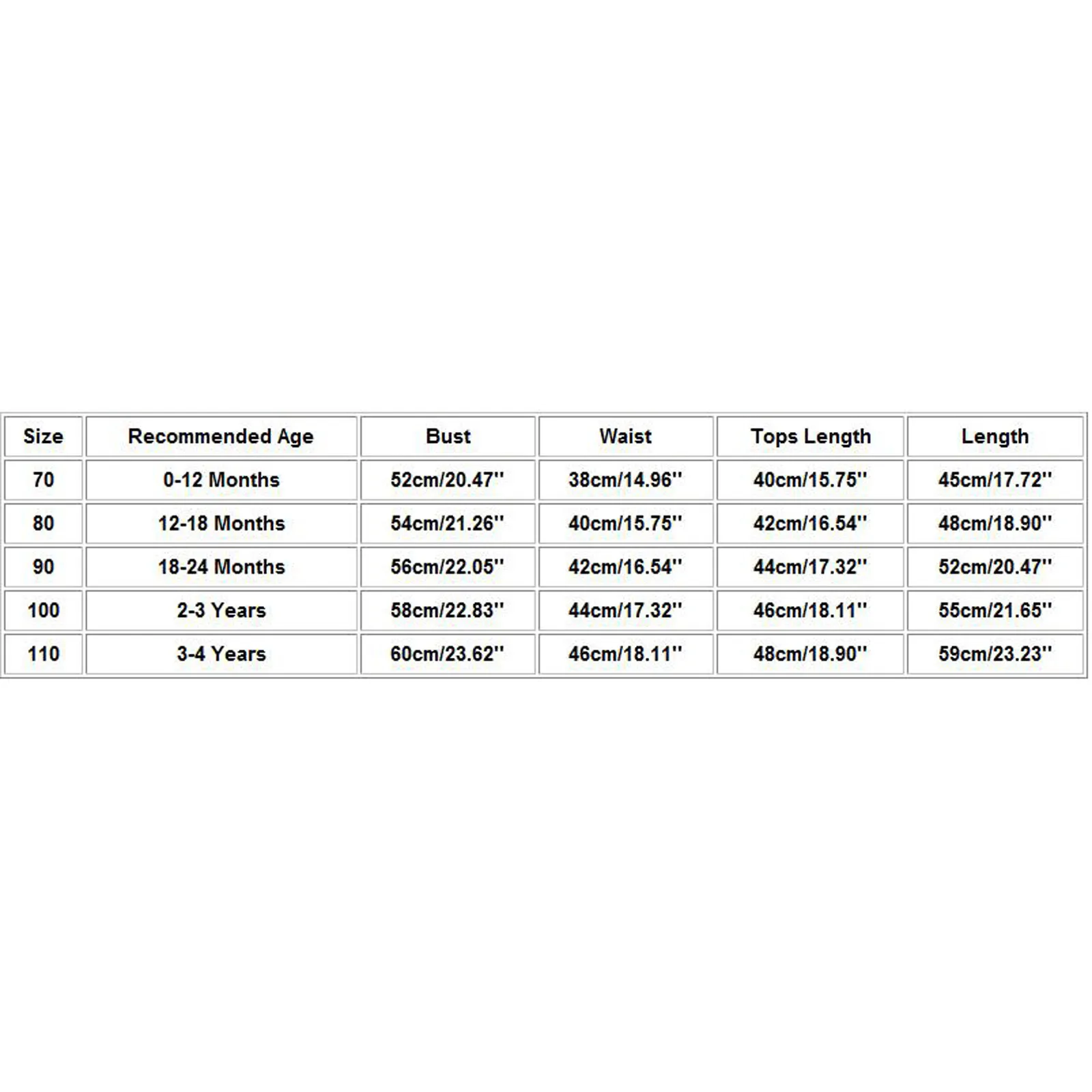 Размер Рекомендуемый возраст Бюст Талия Длина топа Длина 70 0-12 месяцев 52 см/20,47'' 38 см/14,96'' 40 см/15,75'' 45 см/17,72'' 80 12-18 месяцев 54 см/21,26'' 40 см/15,75'' 42 см/16,54'' 48 см/18,90'' 90 18-24 месяцев 56 см/22,05'' 42 см/16,54'' 44 см/17,32'' 52 см/20,47'' 100 От 2 до 3 лет 58 см/22,83'' 44 см/17,32'' 46 см/18,11'' 55 см/21,65'' 110 От 3 до 4 лет 60 см/23,62'' 46 см/18,11'' 48 см/18,90'' 59 см/23,23''