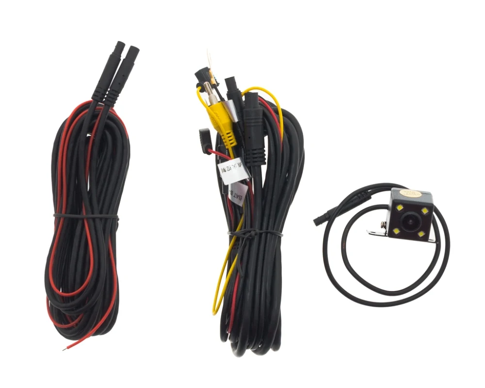 Комплект поставки: Видеорегистратор / Камера заднего вида / Кронштейн на двустороннем скотче / Кабели подключения к сети АСС / Инструкция