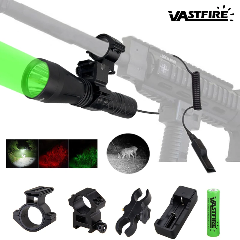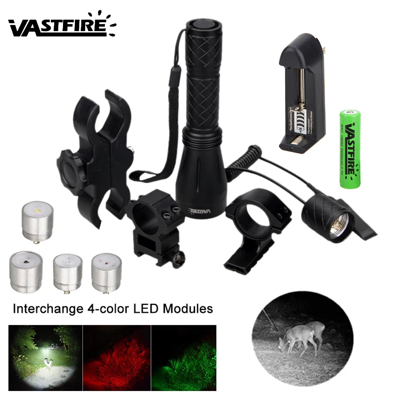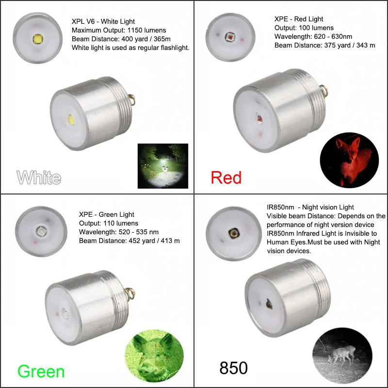 Interchange 4-color LED Modules: 4 different color lights are included in the hunting set--red light, white light, green light and IR850nm light, can meet all need when you are searching for different targets in various hunting situations.Modules are easy to load and unload. Aluminum alloy housing, anodized for durability, rainproof.This hunting flashlight is designed for hunting coyote,hog, bobcat etc. Modes: High Current: 1.5A Operate Voltage: 3.7-8.4V Batteries:1 x 18650 Li-Ion battery ( Dont included) Sizes: length 7.29"(160mm,), head diameter 1.65"(42mm), body diameter 1"(25.5mm) waterproof:IPX4 Material:aluminum Color:black Housing Diameter: 25.4mm (Fit with any 25.4mm Ring or Mount) XPE - Red Light Output: 100 lumens Wavelength: 620 - 630nm Beam Distance: 375 yard / 343 m We highly recommend using red lights for predators. Predators are least likely to be spooked by a red light. XPE - Green Light Output: 110 lumens Wavelength: 520 - 535 nm Beam Distance: 452 yard / 413 m Hogs are color blind and the red or green doesn’t bother them,but hogs are usually dark in color and are much harder to see with the red.This is why green is the preferred choice for hogs.Green light is much easier for the human eye to see than red light which is why most people choose green. XPL V6 - White Light Maximum Output: 1150 lumens Beam Distance: 400 yard / 365m White light is used as regular flashlight. IR850nm - Night vision Light Visible beam Distance: Depends on the performance of night version device IR850nm Infrared Light is Invisible to Human Eyes.Must be used with Night vision devices. Barrel Gun Mount: Product Detail: Easy fit rifle scope mount. No tools reqd to quickly fit to rifle. Working Universally for Torches / Telescope Sights / Lasers. New Mount For Flashlight Torch Telescope Sight Laser Scope Outdoor Hunting. Description: Material: High Quality Plastic Size(mm): full-size:110(L)X40(W)X20(D) Scope mount Anti-shaking design Working range 20-35mm Can be used on smaller scopes/torches with spacer. 20mm Rifle Scope Mount: Product Details: * Color: Black * Material: High Pressure Steel * Rail Size( mm ): 20mm * Mount dia: 25.4mm diameter * Designed to mount flashlight or laser on hand pistols, rifles and shotguns * High quality * Note: Please enaure the mount fit your gun before purchasing it. 1 Inch Ring Mount: Features: High quality aluminum alloy in durable black matte finish Install on 25.4mm & 1 inch riflescope Shock proof Apply with assemble laser, flashligh and red dot sights Can mount either side of the scope (bubble on the top) Easy to use without special tools Package Includes:(Not Include Battery) 1X flashlight body 1X XPE red light module 1X XPE Green Light Module 1X XPL V6 White Light Module 1X IR 850nm module 1X Gun Mount 1X 20mm Scope Mount 1X 25.4mm&30mm Ring Mount