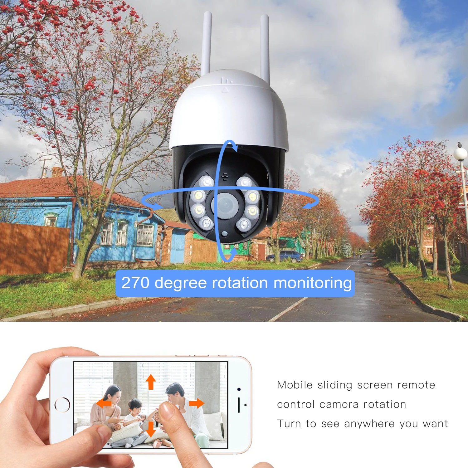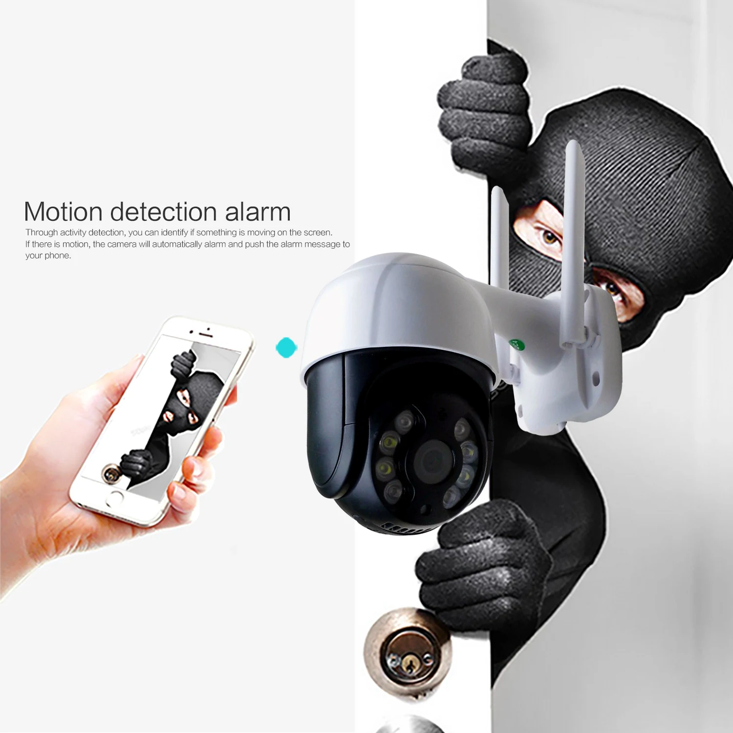 Беспроводная камера безопасности отправит мгновенное оповещение о движении на приложение JIENUO phone. И записывает на sd-карту (звук и видео). Автоматически фотографировать и отправлять электронные письма, с полным оповещением, мы почти не упустите каких-либо улучшенных событий, которые происходит или происходит.