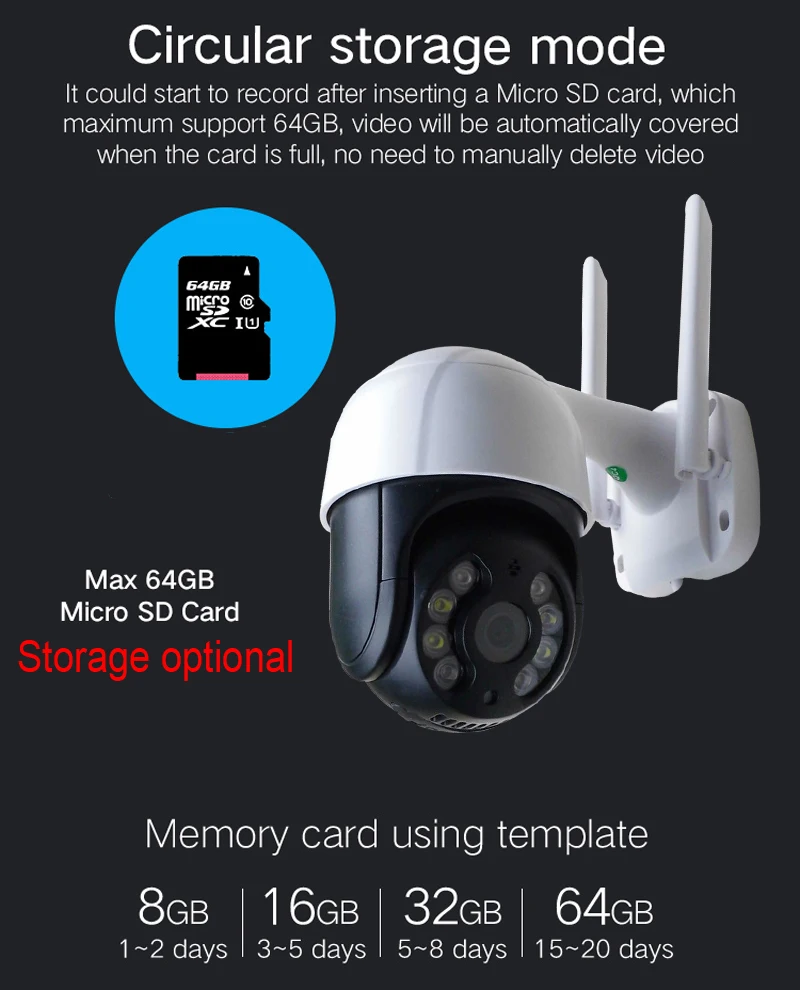 Камера поддерживает Локальное резервное копирование до 64 Гб tf-карты, поддерживает запись видео и звука через карту Micro SD или компьютер, вы можете удаленно воспроизводить видео и звук (история) через мобильное приложение.