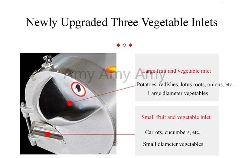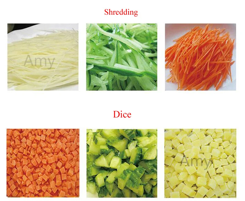 Название продукта: машина для резки овощей с двумя головками Напряжение: 220 В Номинальный Герц: 50 Гц Мощность: 1800 Вт Производственная мощность: 120-850 кг/ч Вес машины: 90 кг Длина разрезов: 1-20 мм Игра в кости Размер: 6/8/10/15/20/25 мм Измельченные Толщина: 2/2.5/3/4/5/6 мм Толщина нарезки: 2/3/4/5 мм Размер машины: 820*570*920 мм