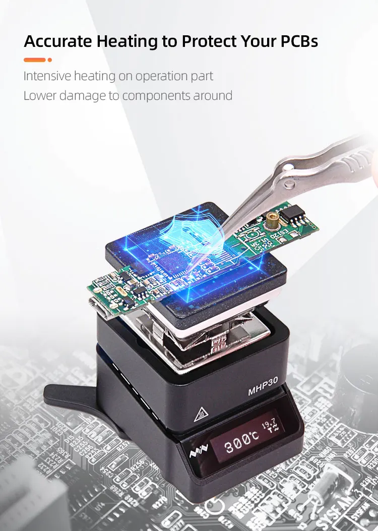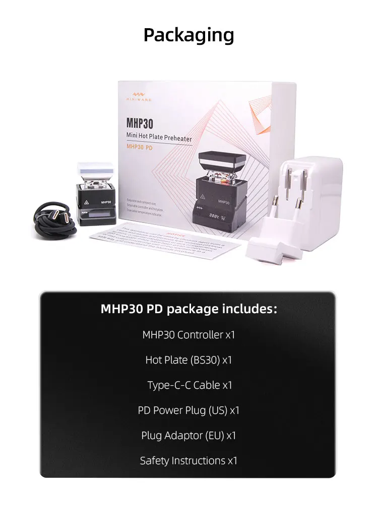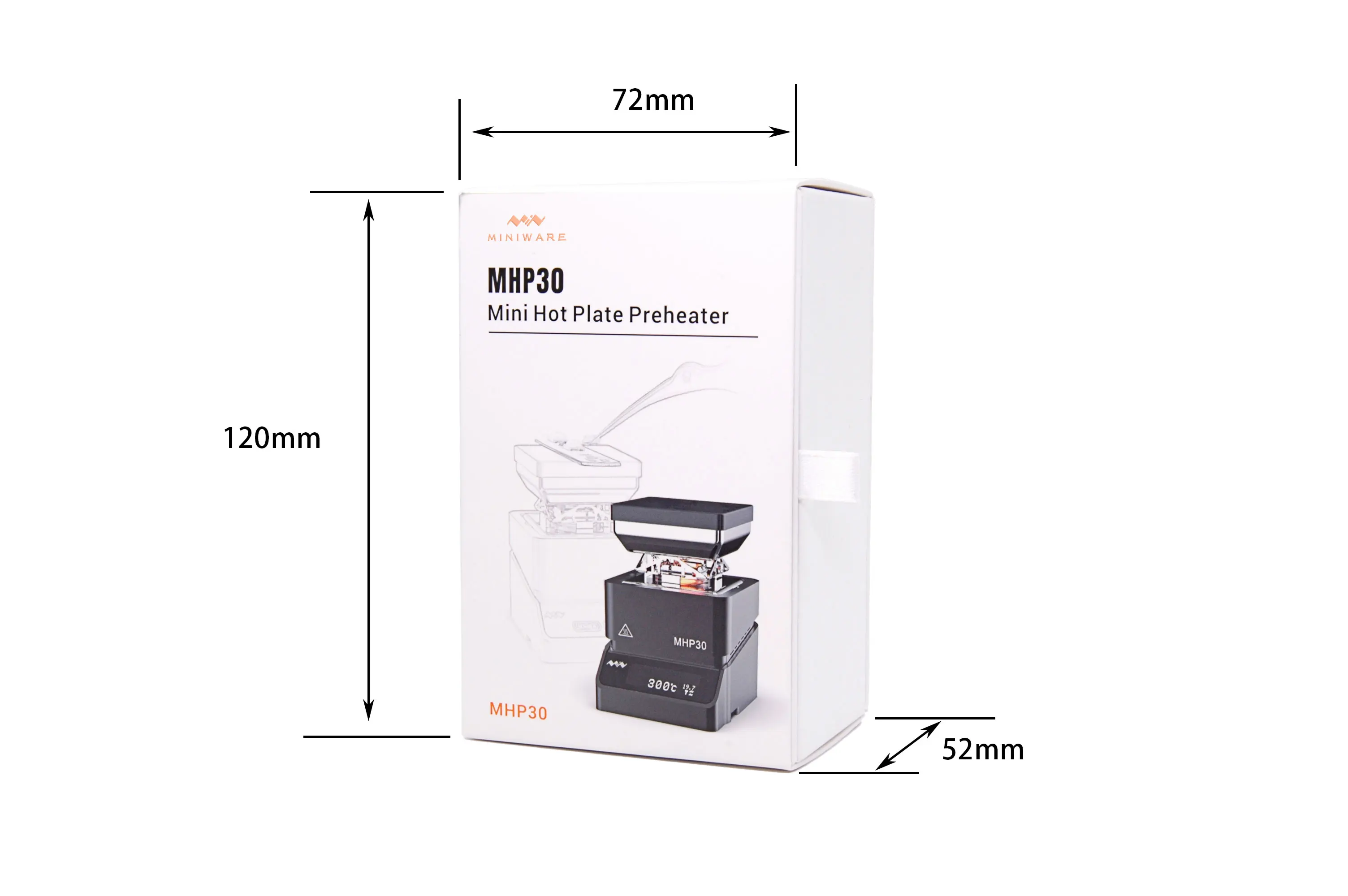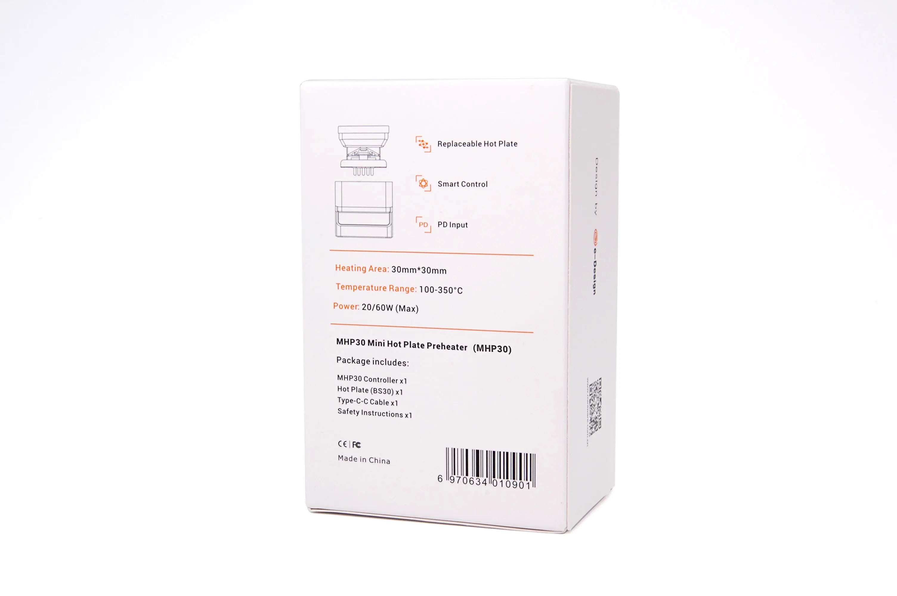 Модель: MHP30 Мощность: 60 Вт (макс.) Размер нагревательной пластины: 30 мм X 30 мм (Д * Ш)-диапазон температур: 100-350 °C Стабильность температуры: 3% Сопротивление заземления: <2Ω Протокол питания: PD зарядка Размер: контроллер: l43мм * w35мм * h31мм; Нагревательная пластина: l31мм * w31мм * h28мм Вес (контроллер + плита): 82 г
