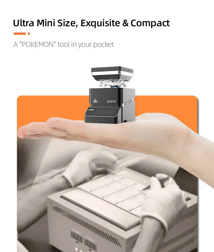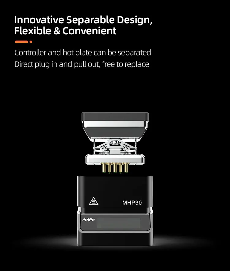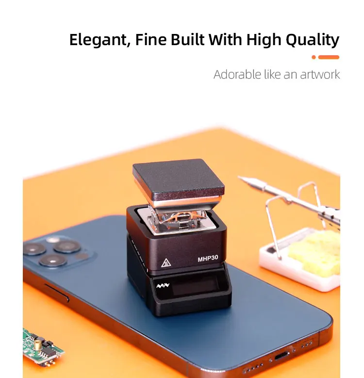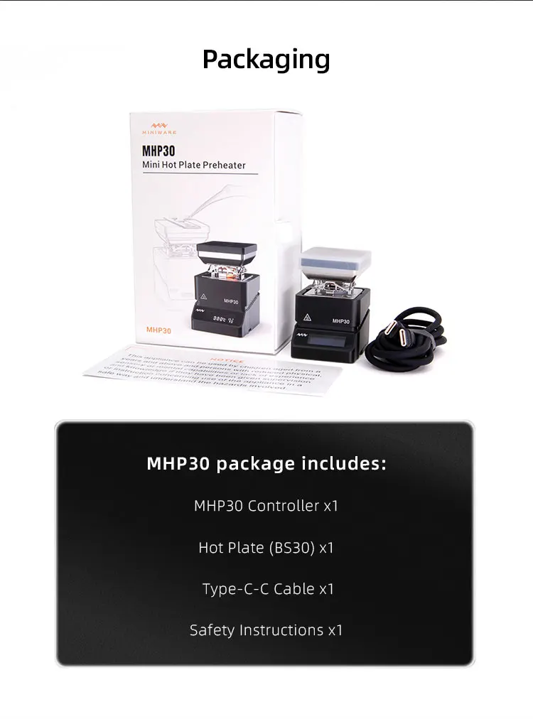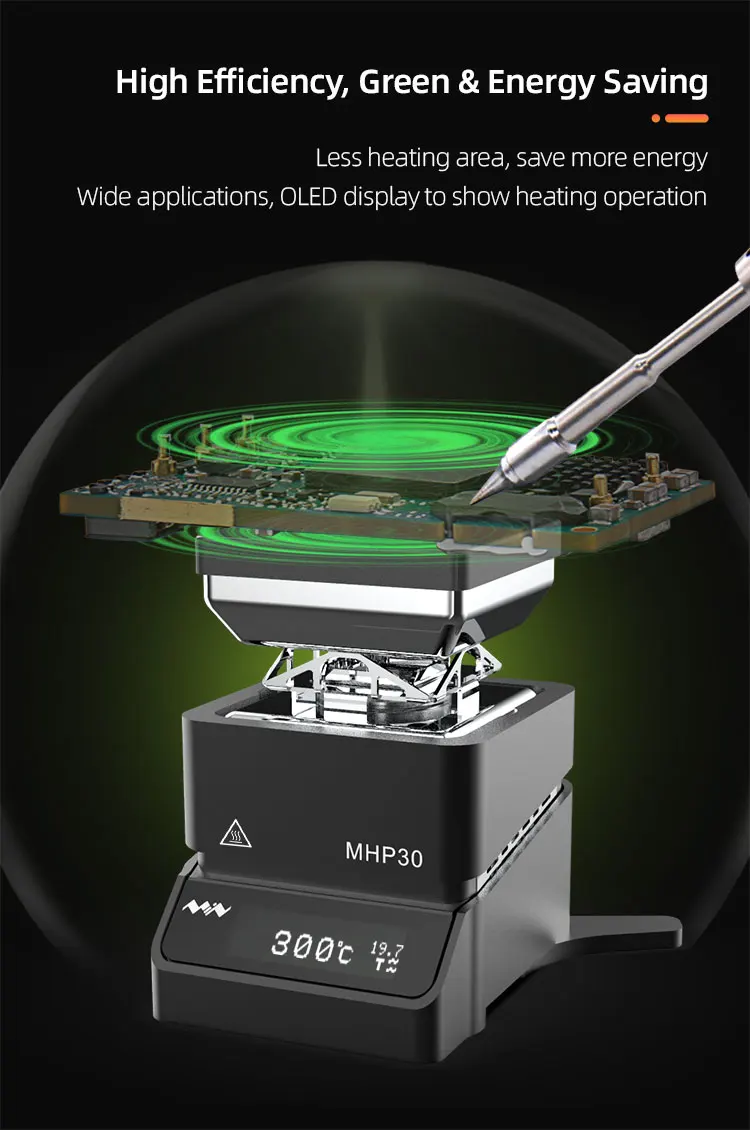 Модель: MHP30 Мощность: 60 Вт (макс.) Размер нагревательной пластины: 30 мм X 30 мм (Д * Ш)-диапазон температур: 100-350 °C Стабильность температуры: 3% Сопротивление заземления: <2Ω Протокол питания: PD зарядка Размер: контроллер: l43мм * w35мм * h31мм; Нагревательная пластина: l31мм * w31мм * h28мм Вес (контроллер + плита): 82 г