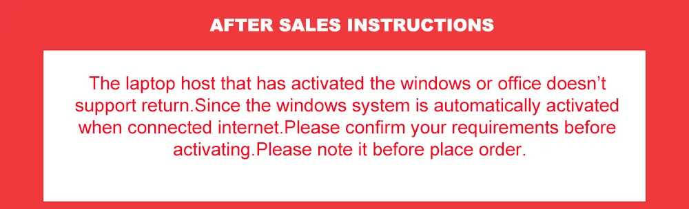 Это высокая стоимость и дорогой товар, поэтому, пожалуйста, проверьте, прежде чем расписаться на посылку. Если вы обнаружите проблемы, такие как повреждение, вызванное транспортировкой или отличие товара от того, что вы заказали после того, как вы подписали посылку, мы не будем нести за это ответственность. Если вы обнаружите какие-либо поломки после доставки, необходимо распаковать видео и отгрузку этикетки компании. Столкновения во время транспортировки могут привести к непоправимому повреждению экрана. Поэтому, даже если коробка отгрузки находится в хорошем состоянии, мы по-прежнему предоставляем услугу проверки ноутбука.