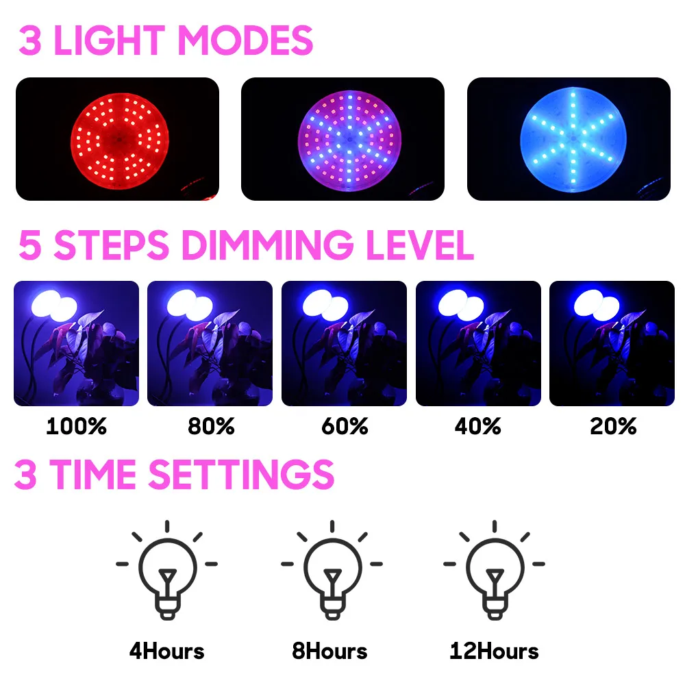 [5 режимов затемнения и 3 режима переключения]: Эти лампы для выращивания обеспечивают 5 режимов затемнения и 3 режима спектра для различных этапов роста растений. Он подстраивается под уровень интенсивности 20%, 40%, 60%, 80% и 100% светильник и имеет 3 спектральных режима (красный, синий и смешанный светильник) для удовлетворения различных стадий потребностей растениеводства.