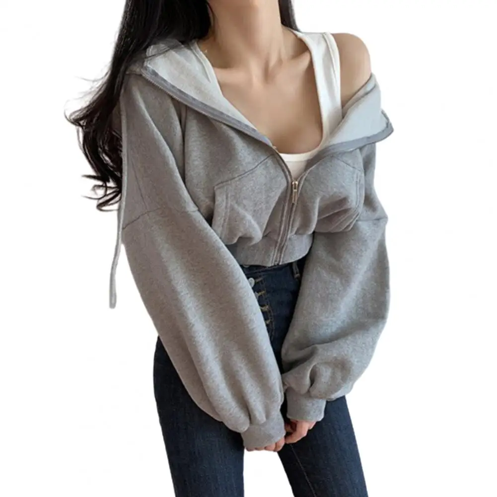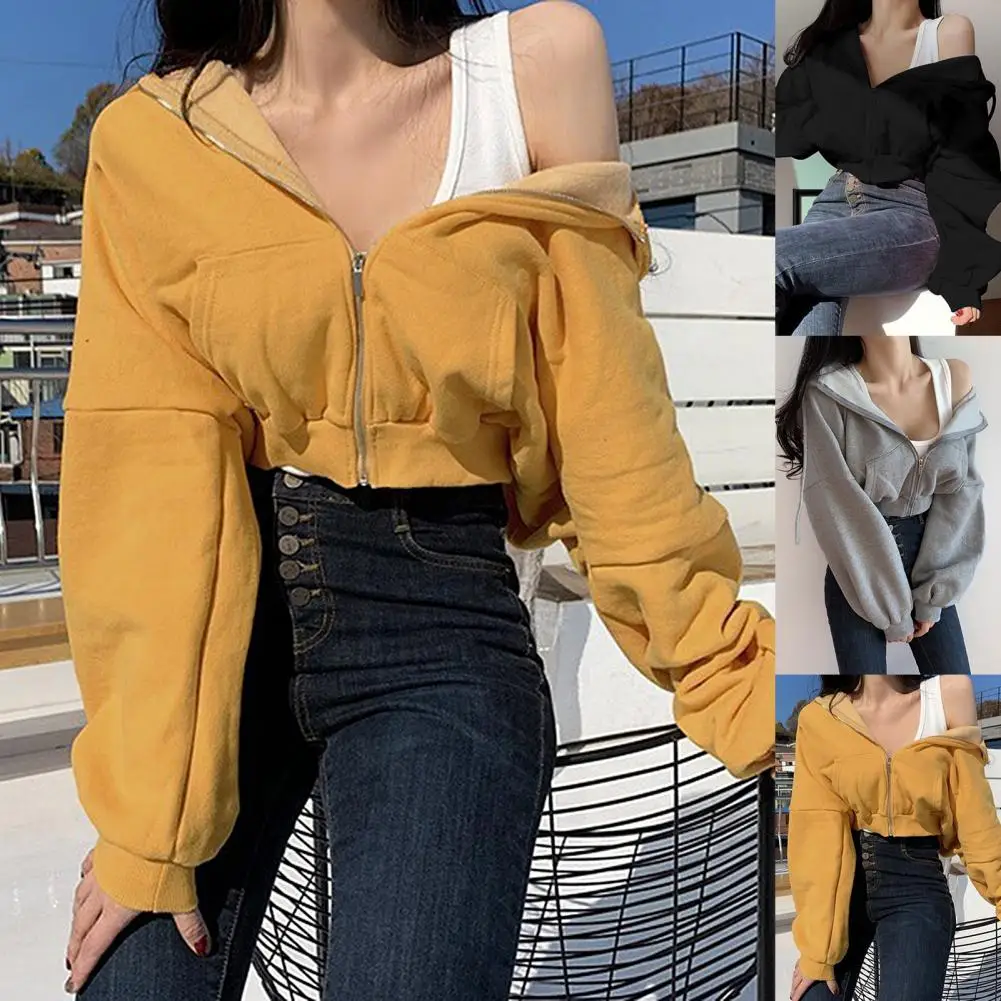 Женский однотонный укороченный топ с карманами и длинным рукавом, плюшевое теплое пальто на молнии с капюшоном