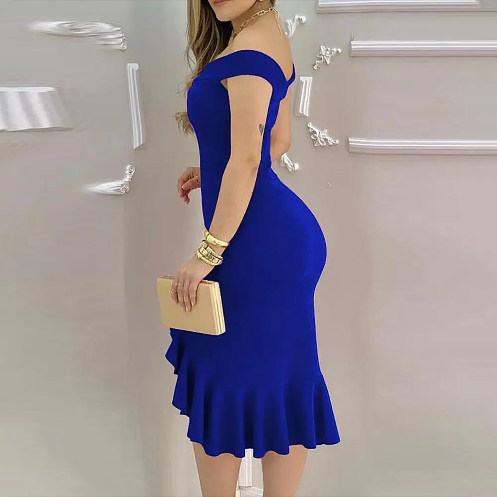 Это облегающее платье с открытыми плечами и раздельным подолом с рюшами, подчеркивает вашу сексуальную фигуру и делает вас модным.