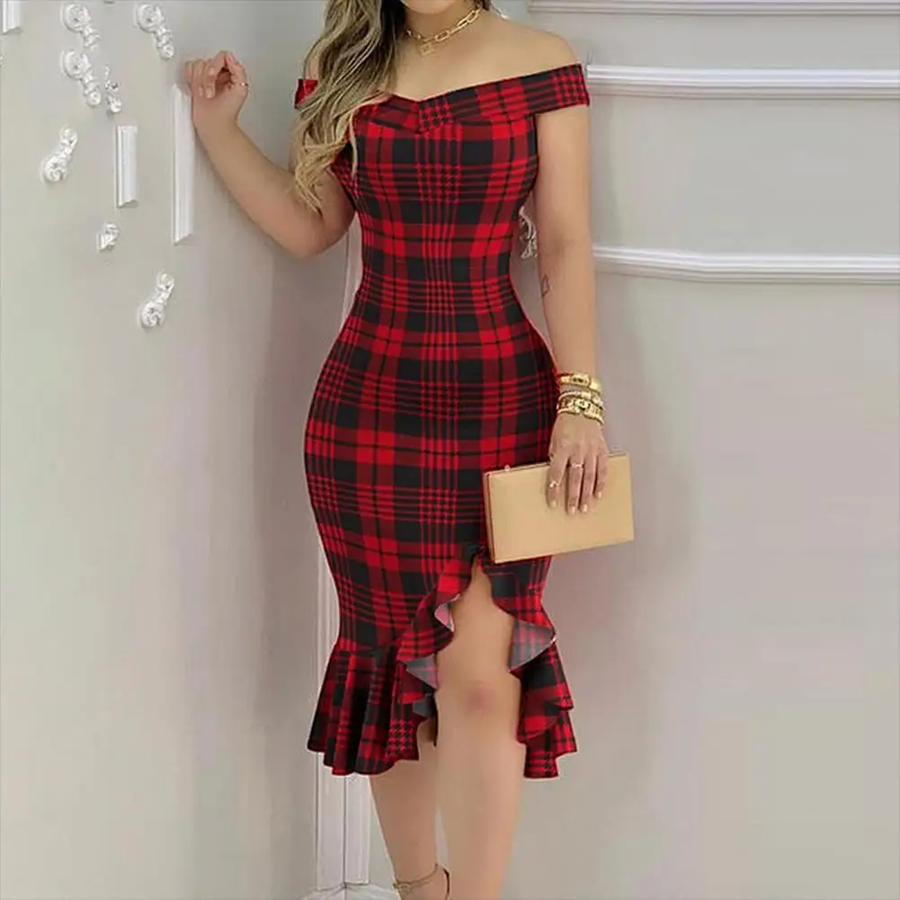 Женское сексуальное платье до колена с открытыми плечами и оборками, однотонное облегающее платье в клетку