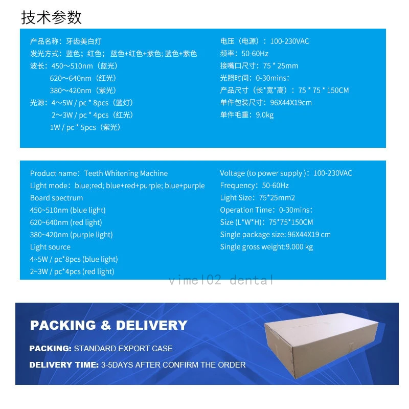 Это Отбеливающее устройство представляет собой новую технологию отбеливания, основанную на условиях сисветодиодный светодиодного освещения и ускорителя набора отбеливания. По характеру нанометрпеллет на поверхности светильник легкого разложения активируйте самый отбеливающий комплект ускоритель в коротком порядке на низкой или нормальной температуре.