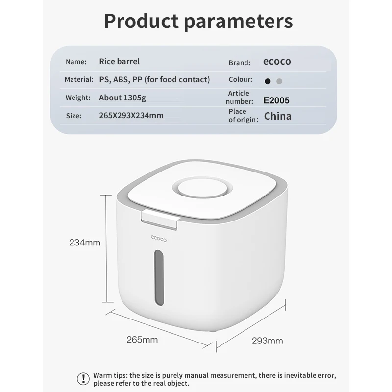 2. Большая емкость.Легко загружать 10 кг риса, стенка ствола толстая, и грузоподъемность сильна. Можно положить несколько видов использования, цельные зерна, муку, орехи, корм для собак